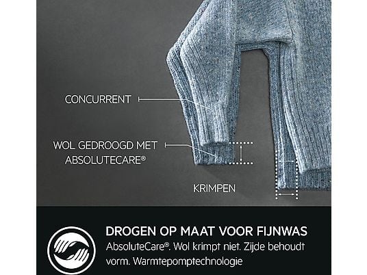 AbsoluteCare® gebruikt warmtepomptechnologie, in combinatie met nauwkeurige trommelbewegingen en temperaturen om je kleding veilig te drogen, zelfs je fijne was. AbsoluteCare® zorgt dat wol niet krimpt en zijde haar vorm niet verliest, herstelt waterdichtheid van outdoorkleding en is Woolmark Blue-gecertificeerd.