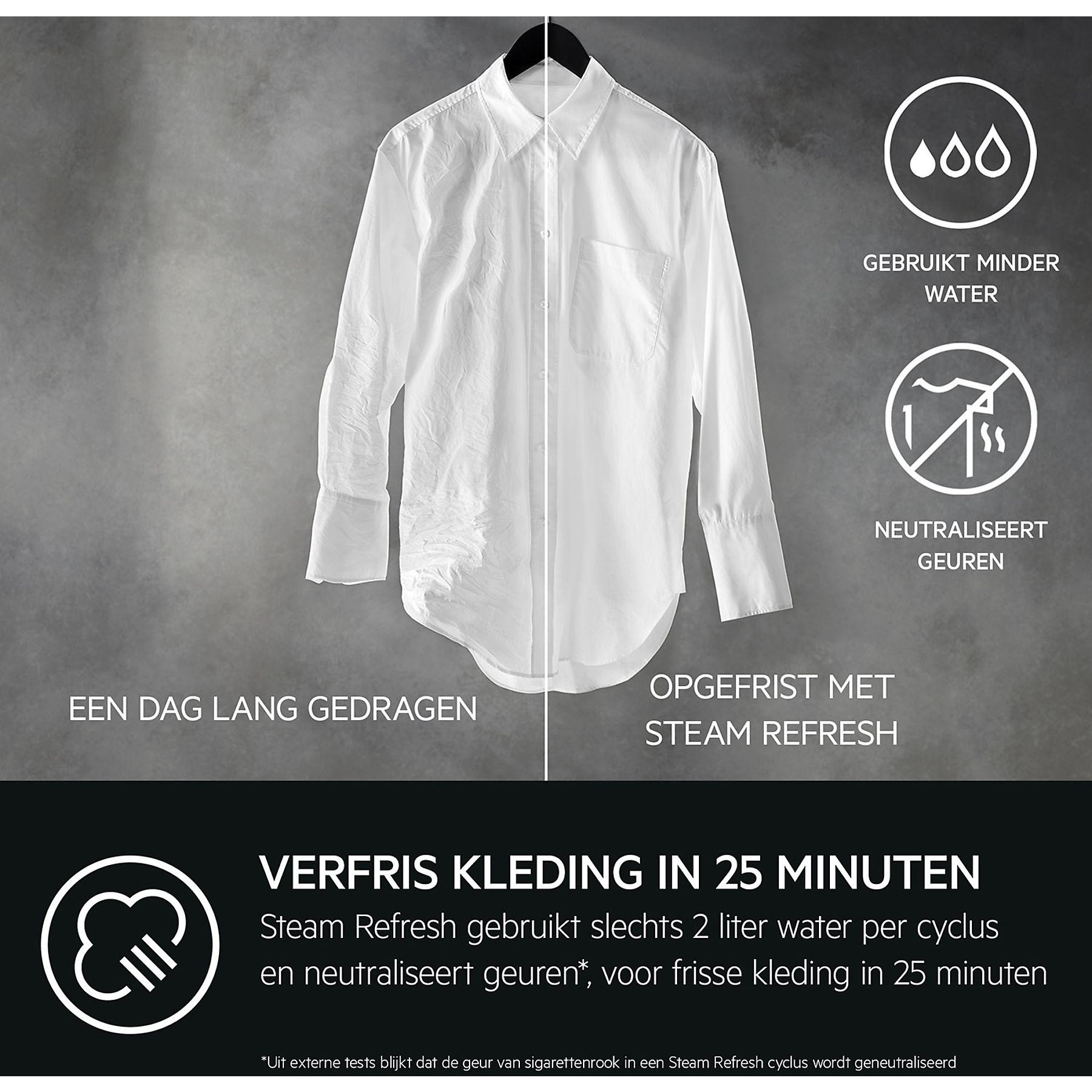Steam Refresh neutraliseert geurtjes* en vermindert kreuken in kledingstukken, ook in fijne was, in slechts 25 minuten. En als je van een extra boost frisheid houdt, voeg je gewoon onze aromatische stoomgeur toe. Dat geeft het die net gewassen frisheid.