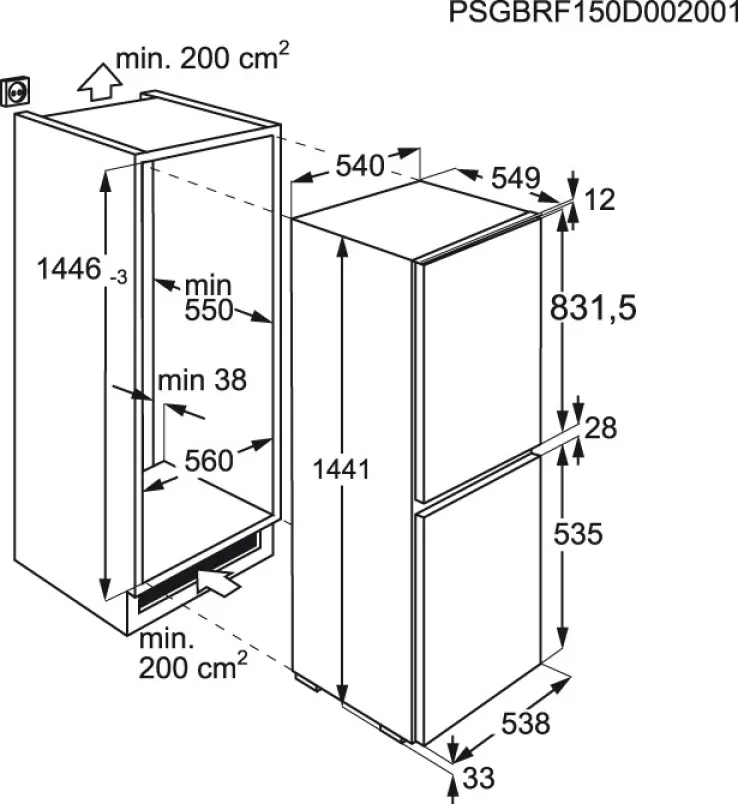 Inbouwafmetingen HxBxD (mm): 1446x560x550