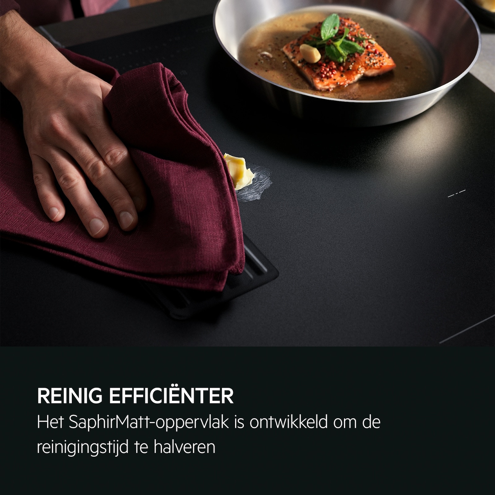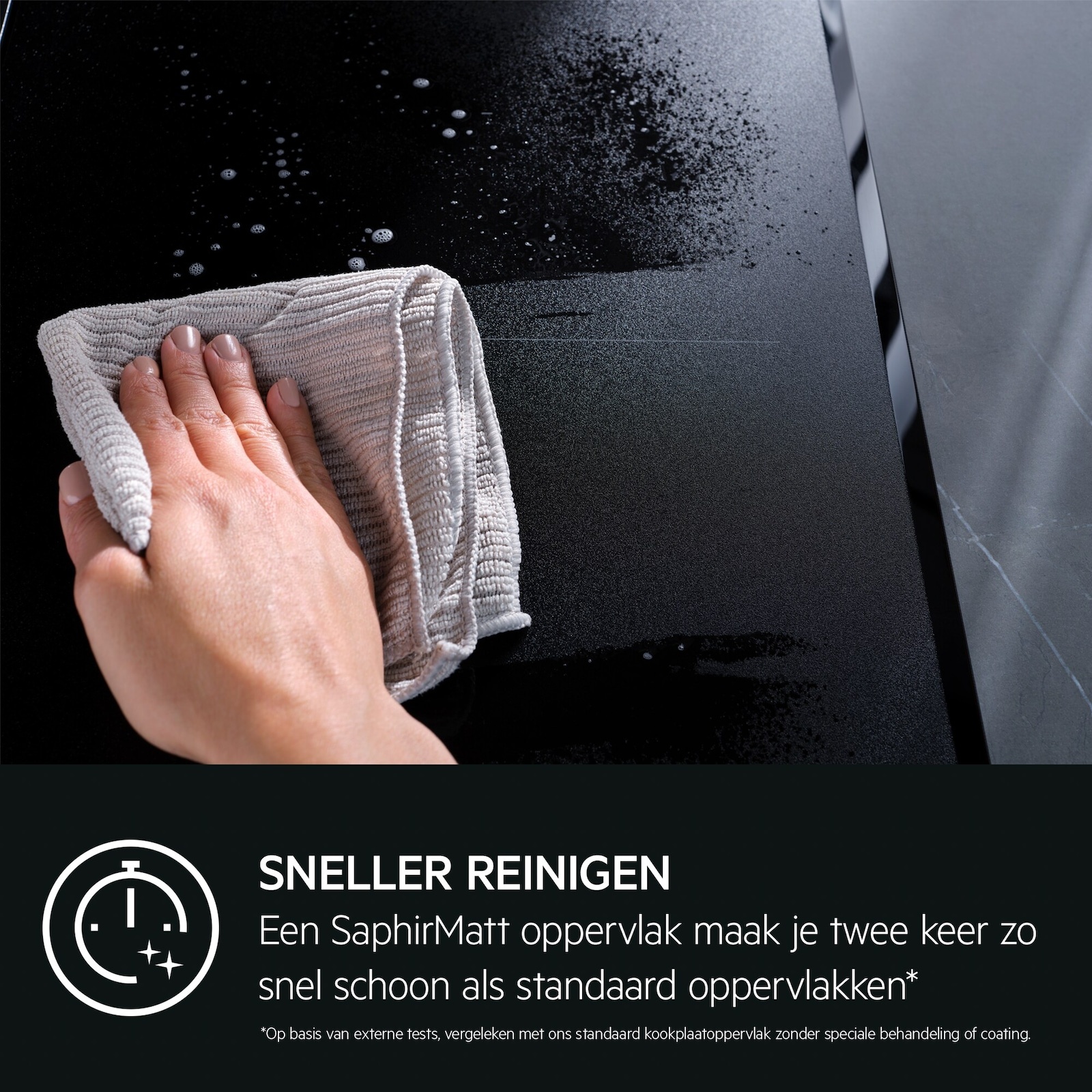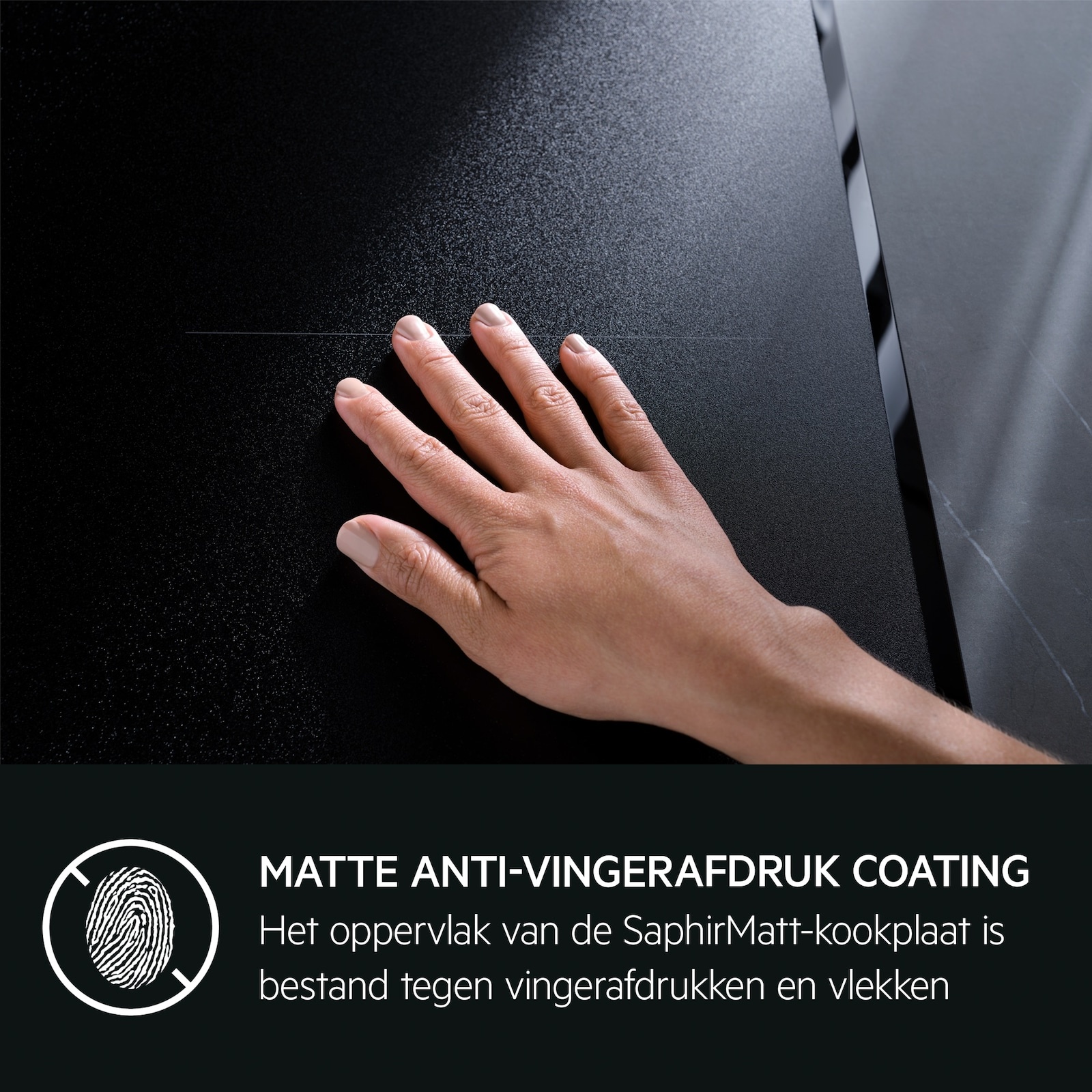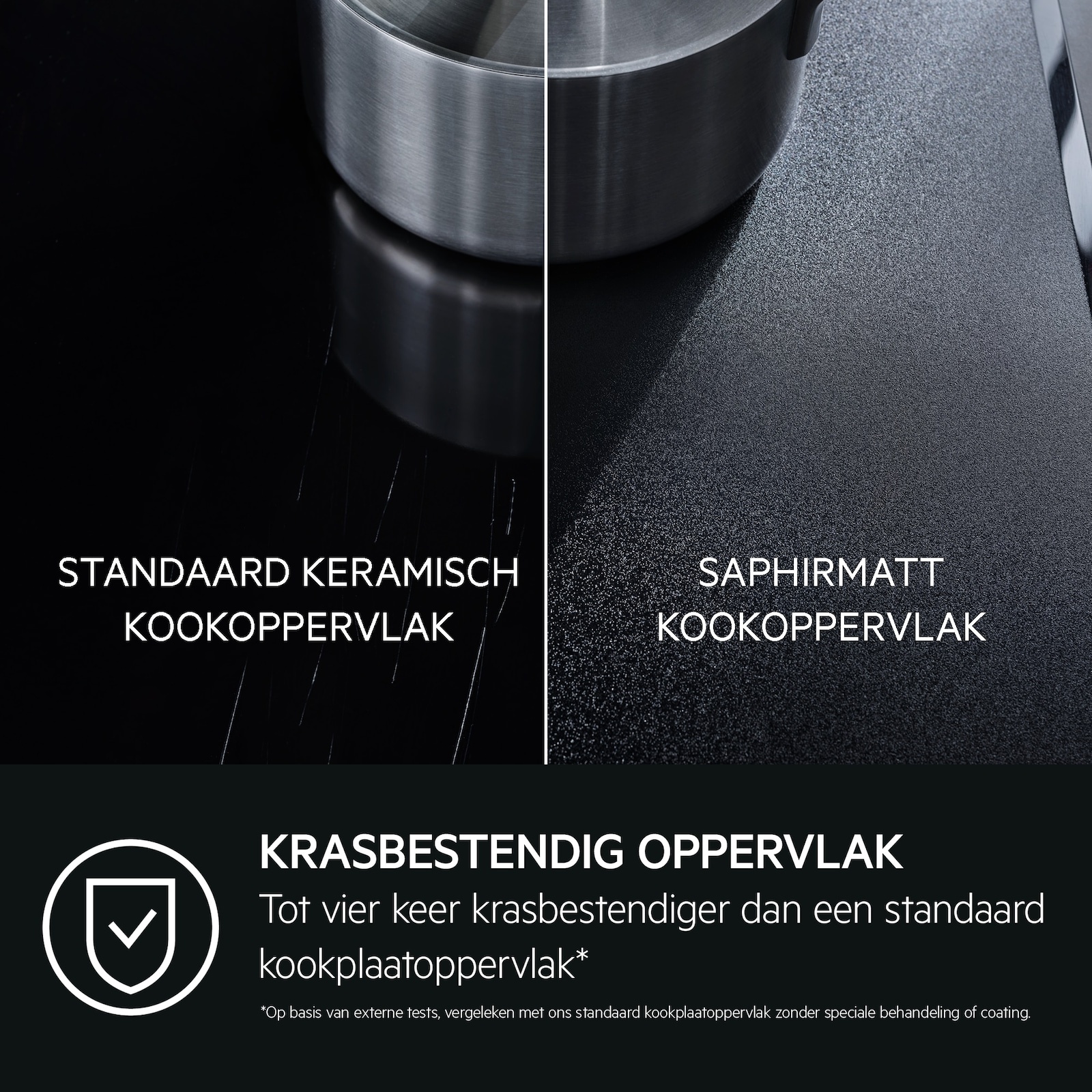 Het SaphirMatt-glas biedt superieure bescherming tegen krassen in vergelijking met onze standaard keramische kookplaten. De elegante zwarte matte afwerking is bestand tegen vingerafdrukken en vlekken – waardoor jouw kookplaat er langer als nieuw blijft uitzien.