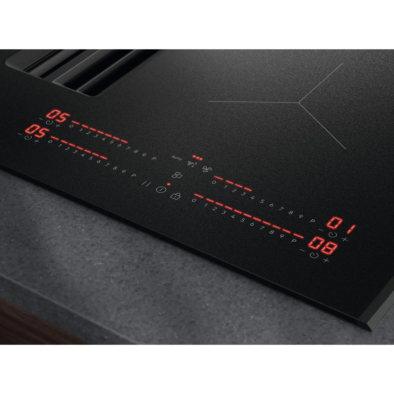 De kookplaat biedt alle voordelen van een 70 cm glazen inductiekookplaat, maar past dankzij de V-vormige bodem gemakkelijk in een 60 cm keukenkastje. Hij beschikt ook over een krachtige, geïntegreerde afzuigkap met een aerodynamisch design voor optimale luchtstroom.