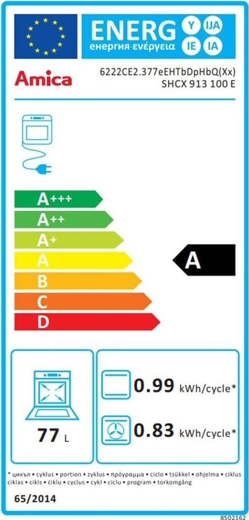 Model SHCX 913 100 E Type fornuis Elektrisch Uitvoering Vrijstaand Oveninhoud 77 liter Aantal ovens 1 Energieklasse A Energieverbruik hetelucht 0,83 kWh Energieverbruik conventioneel 0,99 kWh Aantal ovenfuncties 9 Boven- en onderwarmte Grillfunctie Ontdooifunctie Eco functie Telescopische rails 1 niveau CoolDoor koele deur Binnenverlichting halogeen SteamClean reiniging Clean emaille binnenruimte Verzonken knoppen Timer digitaal Restwarmte-indicatie Spanning 400 V Aansluitwaarde 10200 W Breedte 60 cm Hoogte 85 cm Diepte 60 cm Gewicht 46 kg