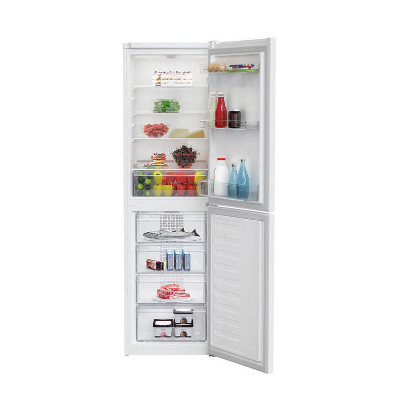 Beko RCHE300K20W koelvriescombinatie met energieklasse A+, een koelruimte van 168 liter en een vriesruimte van 95 liter. Deze koelvriescombinatie is slechts 55 cm breed, bij uitstek geschikt voor de kleinere keuken of bijkeuken, met een inhoud die dus niet onder doet voor de traditionele 60 cm brede koelvriescombinatie. Je hebt de beschikking over 4 plateaus waarvan 1 boven de groentelade, 3 deurvakken en een ruime groentelade. Het maakt niet uit hoe je het koelgedeelte indeelt, dankzij de luchtcirculatie zijn alle plekjes even koud. Met 4 transparante vrieslades zie je in een oogopslag wat je nog op voorraad hebt. Ook is de RCHE300K20W voorzien van snelvriezen - dat wil zeggen dat pas ingeladen voedsel sneller wordt ingevroren en biedt zo bescherming voor reeds ingevroren voedingsmiddelen.