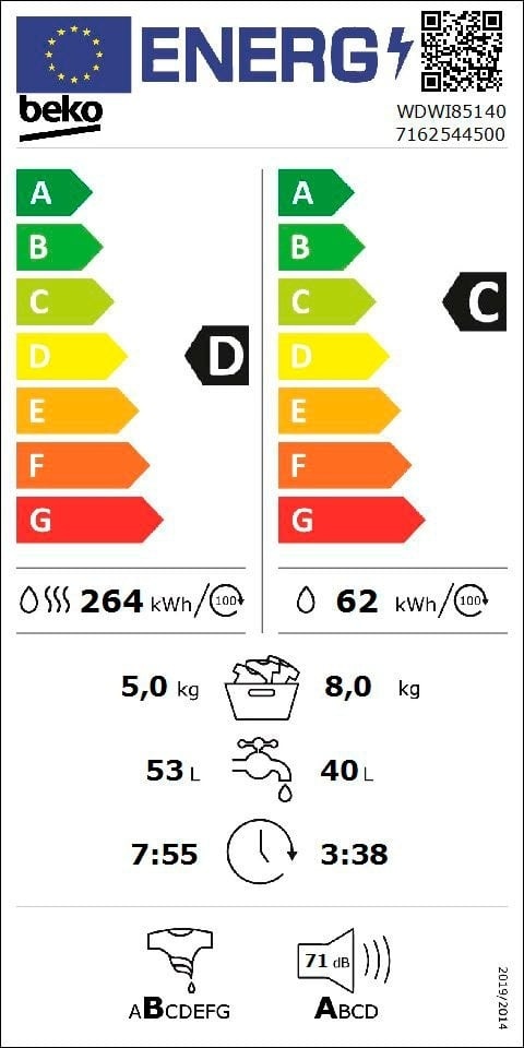 Energieverbruik per 100 cycli wassen & drogen: 264 kWh