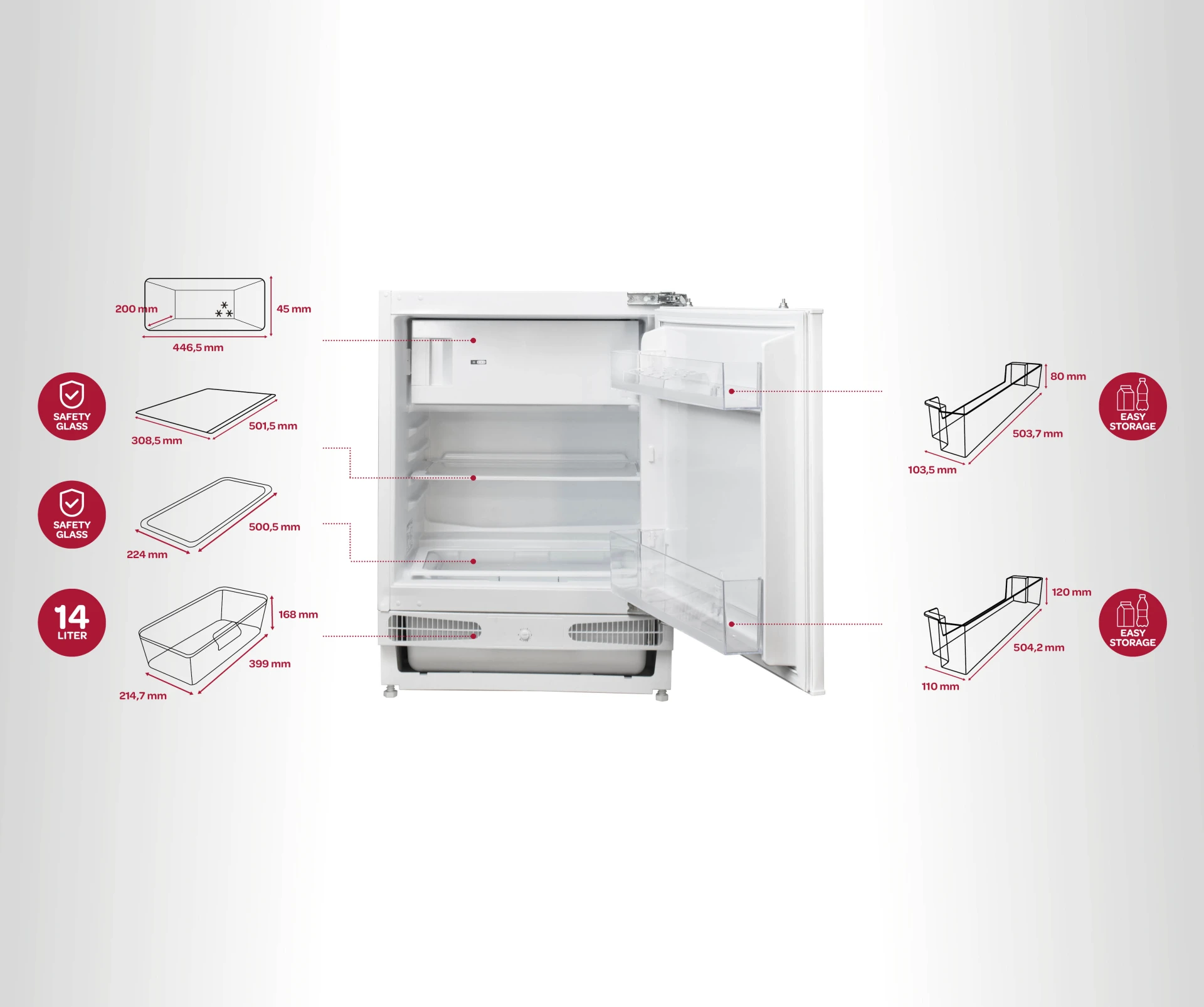 De Inventum onderbouw koelkast IKV0821D is geschikt voor een standaard nismaat van 82 cm en heeft een inhoud van 115 liter. Het is een koelkast met energieklasse E. Het 4 sterren vriesgedeelte met een inhoud van 17 liter, heeft een invriesvermogen van 2,6 kg/24u. De koelkast heeft 2 draagplateaus en onderin 1 transparante groentelade. Met 1 deurvak, 1 flesvak en 1 eierrekje berg je al je etenswaren netjes op. Deze onderdelen zijn eenvoudig te verwijderen, zodat je deze goed kunt schoonmaken.