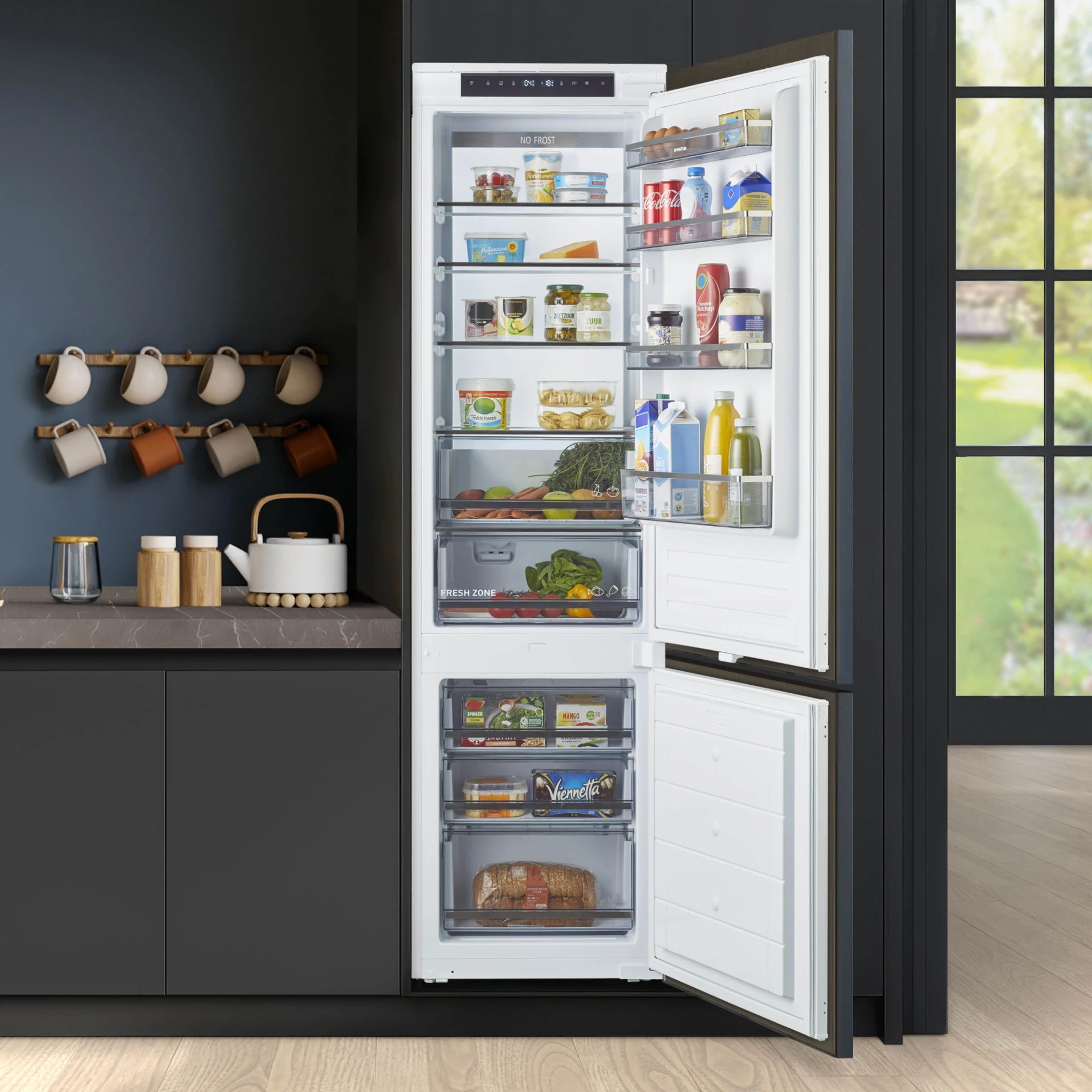 De Inventum inbouw koel-vriescombinatie IKV1945S met een inhoud van 267 liter en energieklasse D, is geschikt voor een nis van 194 cm. Het ruime koelgedeelte van 200 liter heeft een luxe ambient light achterwand. In de handige Fresh zone groentelade en door superkoelen kun je al je etenswaren extra lang bewaren. Het vriesgedeelte met supervriezen heeft 3 transparante lades en een inhoud van 67 liter. In deze No Frost koelkast is genoeg ruimte om al je etenswaren netjes op te bergen. De 4 draagplateaus, 4 deurvakken en 5 lades zijn eenvoudig te verwijderen, zodat je ze gemakkelijk kunt schoonmaken.