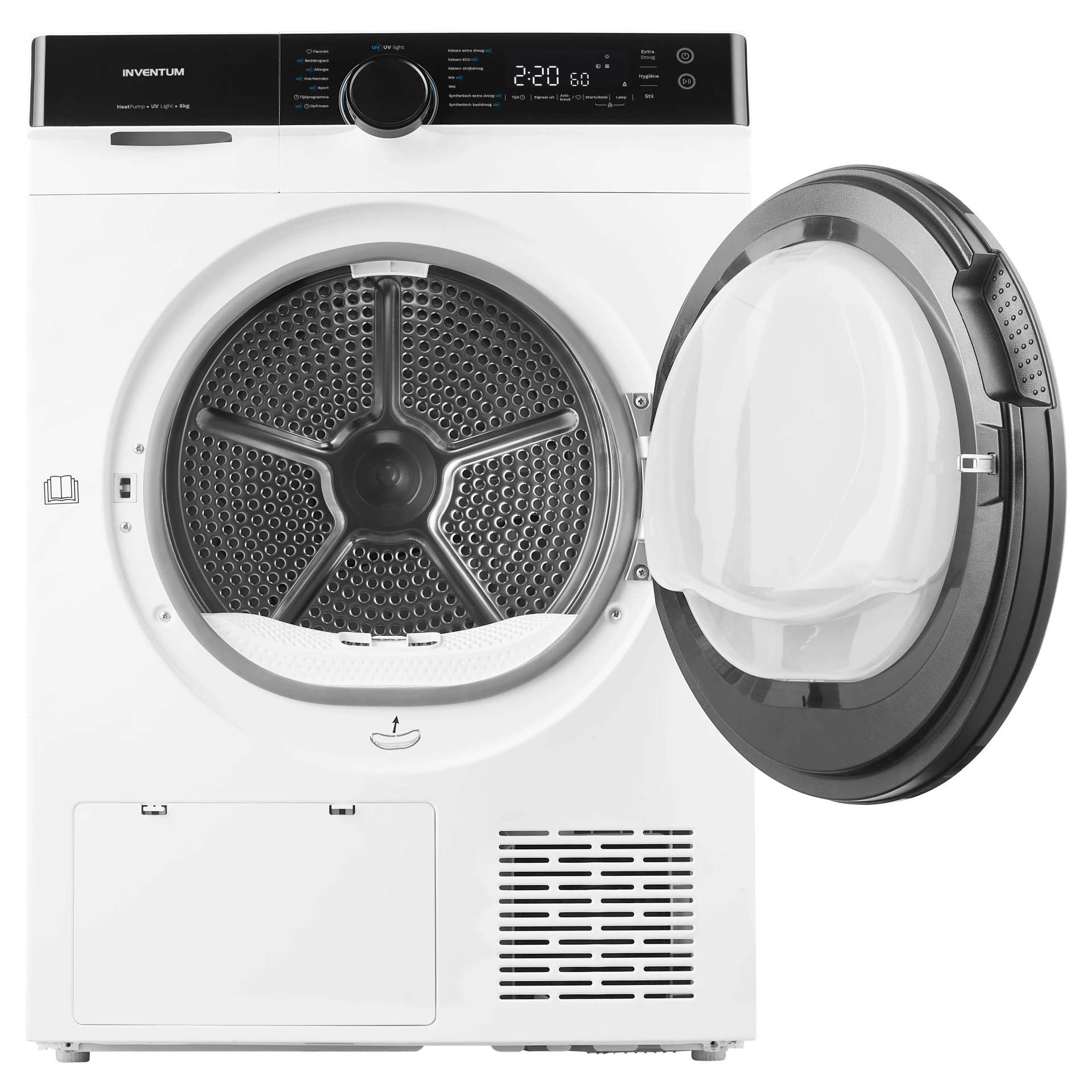 De zeer zuinige Inventum warmtepompdroger VDW8030W heeft energieklasse C en een vulgewicht van 8 kg. Daarmee droog je het wasgoed van 3 tot 4 personen. Je hebt de keuze uit 14 droogprogramma's, waaronder een programma voor sportkleding, dons en delicate was. Je kunt aan meeste programma's UV-licht toevoegen voor een extra hygiënisch wasresultaat. Voor minder geluid in de avond of nacht kun je de Stil-functie aanzetten. Door de handige verlichting in de trommel zie je ook nooit meer een kledingstuk over het hoofd. Deze wasdroger kun je aansluiten op een waterafvoer of het water opvangen in het condensbakje. Gebruik je vaak hetzelfde programma en instellingen? Maak daar dan je Favoriete programma van. Lekker makkelijk! Zo ben je nog sneller klaar met de was. Het is ook goed om te weten dat een warmtepompdroger veel minder energie verbruikt dan andere wasdrogers. Dat is goed voor je portemonnee en beter voor het milieu.