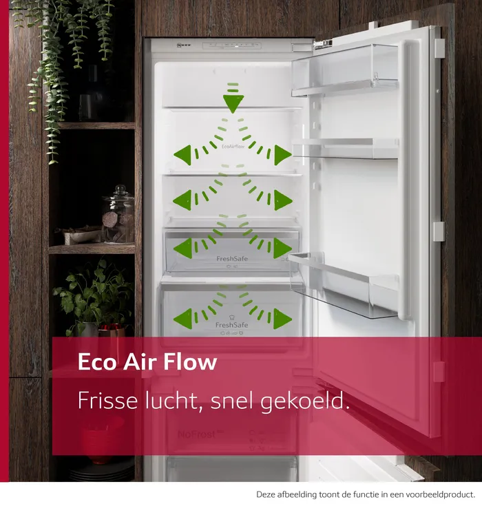 De ingrediënten die je zo aandachtig hebt gekozen, worden in je koelkast met evenveel zorg en aandacht behandeld dankzij Eco Air Flow. Dit systeem zorgt voor een gelijkmatige luchtcirculatie voor een constante temperatuur, zodat je etenswaren lekker vers blijven.