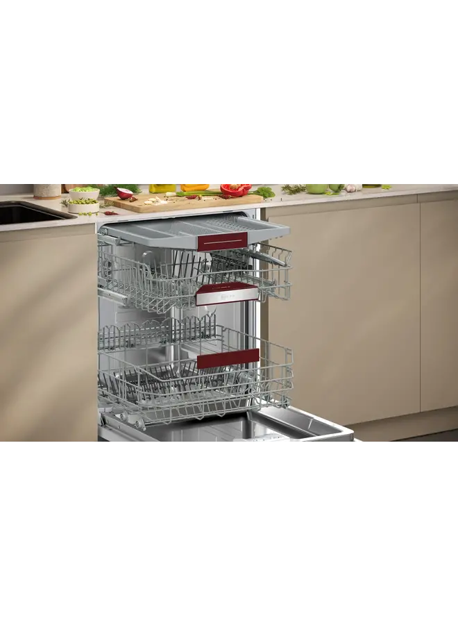 Onze Flex 1-korven beschikken over twee verstelbare elementen in zowel de boven- als onderkorf die ervoor zorgen dat verschillende items probleemloos ingeladen kunnen worden, inclusief grotere borden of groter kookgerei. Dankzij RackMatic kan met een druk op de zijdelingse hendel de bovenste korf van de vaatwasser - zelfs volgeladen - op 3 verschillende hoogteniveaus worden ingesteld. Plaats je bestek, keukengerei en scherpe messen in de flexibele besteklade, terwijl zachte siliconen beschermers goed voor je delicaat glaswerk in de bovenkorf zorgen. Dankzij hogere zijwanden in de onderkorf blijven snijplanken en grote borden op hun plek zitten.