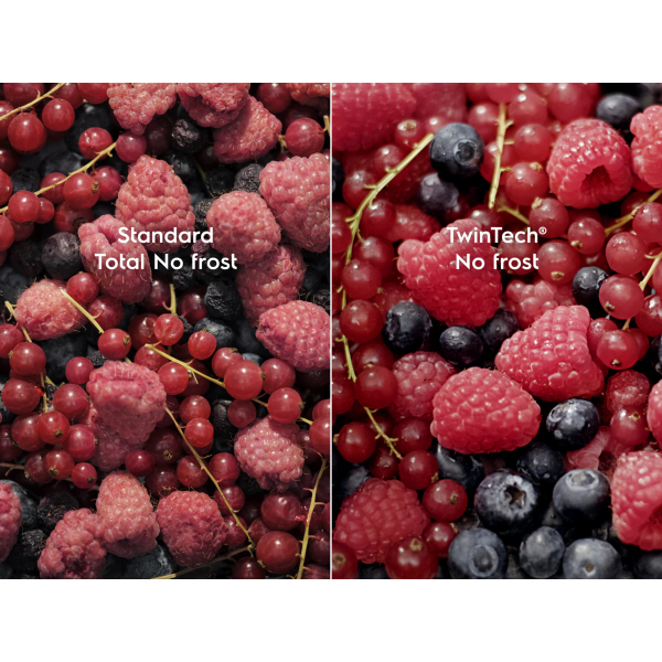 Met TwinTech® No Frost blijven je producten sappig en vol smaak. Het dubbele koelsysteem voorkomt ijsvorming in de vriezer en zorgt voor een optimale luchtvochtigheid in de koelkast. Geen uitdroging, geen gedoe met ontdooien.