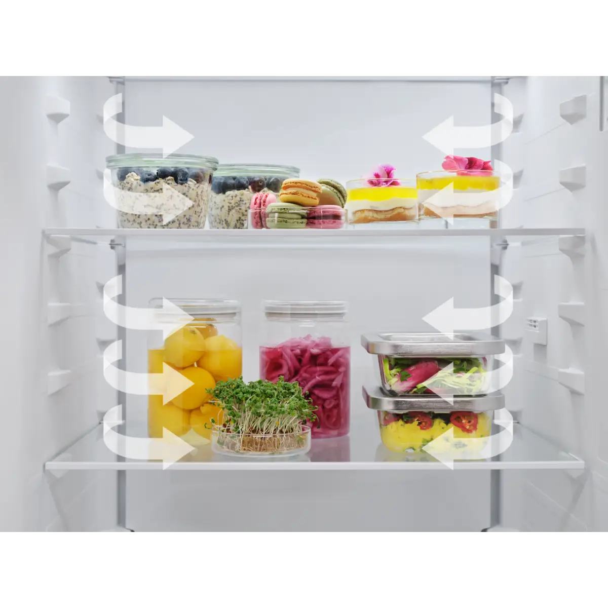 Constante luchtcirculatie voorkomt temperatuurschommelingen. Zo blijven vleeswaren, groenten en zuivel langer vers — zelfs als de deur vaak open gaat.