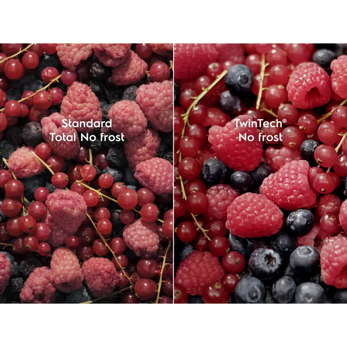 Geen ijsvorming meer én tot 60% meer vochtbehoud in je groenten en fruit. Dankzij het dubbele koelsysteem blijft het koelgedeelte vochtig, terwijl het vriesvak ijsvrij blijft. Minder uitdroging, meer smaak.