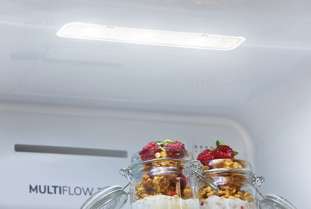 De MultiFlow 360° ventilator zorgt voor een gelijkmatige koeling in zowel het koel- als het vriesgedeelte, zodat producten lang vers blijven.