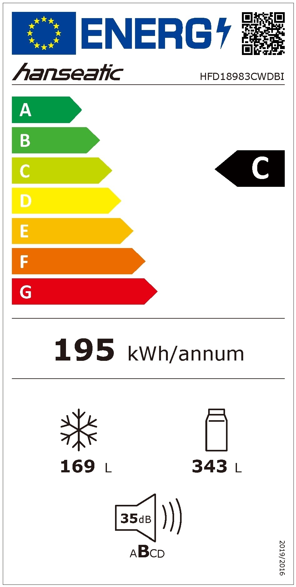 De vrijstaande French door-koelkast HFD18983CWDBI van Hanseatic combineert hoge functionaliteit met energieklasse C (A–G). Met afmetingen van 83 × 190 × 65 cm (B/H/D) biedt het model enorm veel opslagruimte: 343 liter koelruimte en 169 liter vriesruimte.