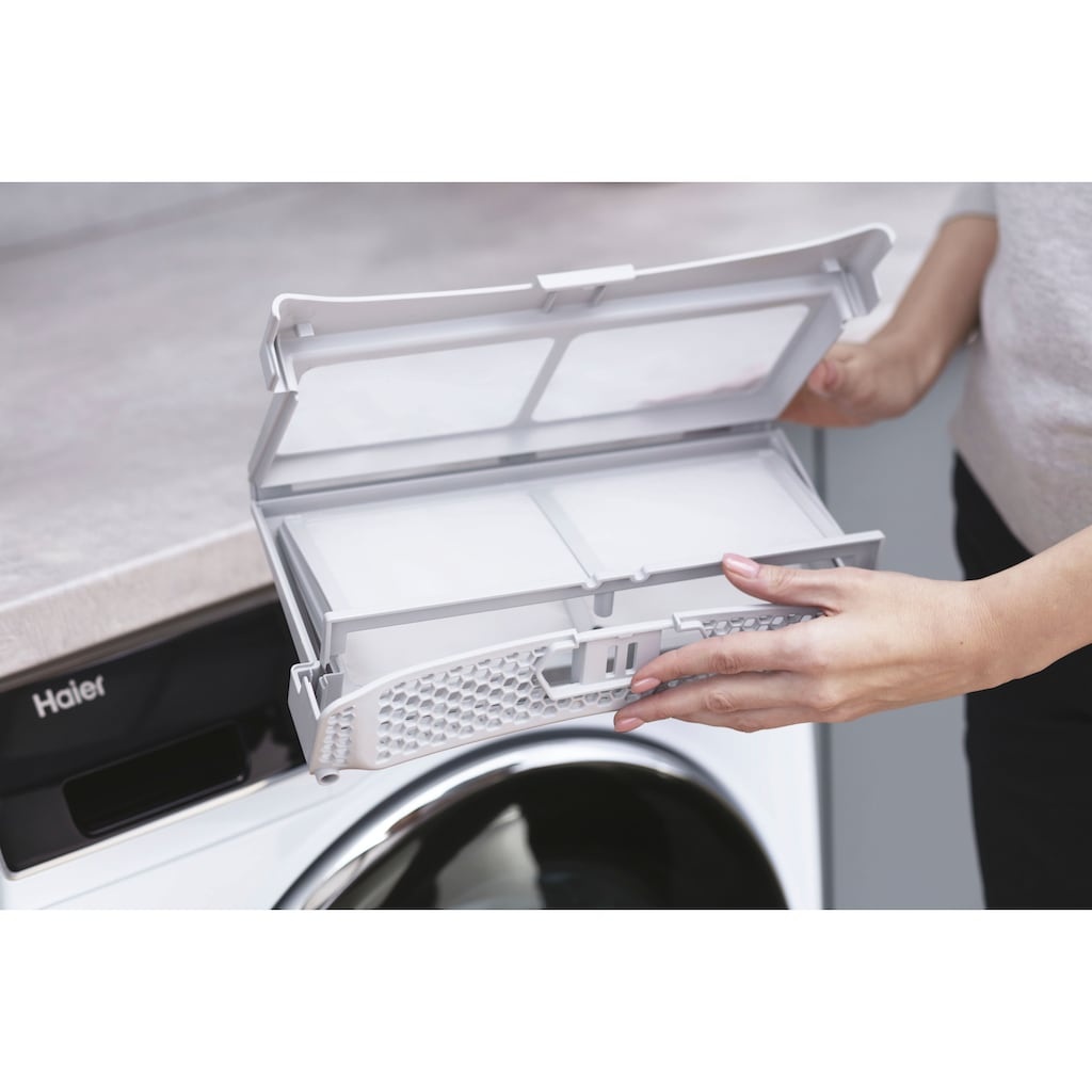Het nieuwe 3-in-1-filter van Haier is elegant geïntegreerd in het onderste deel van de patrijspoort, waardoor het gemakkelijk te verwijderen en te reinigen is met een simpele beweging. Een innovatief, minimalistisch ontwerp dat u kostbare tijd bespaart.