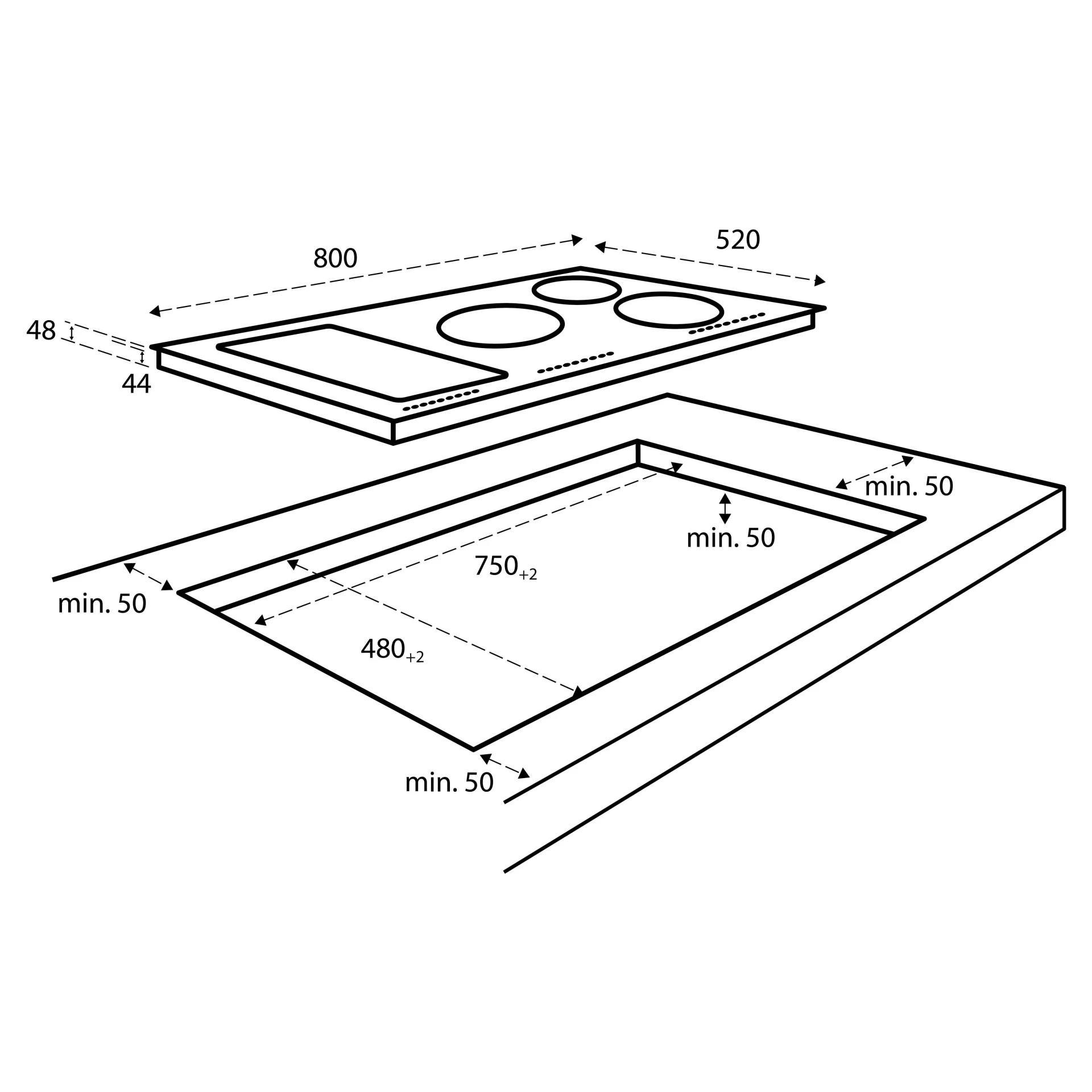 Inbouwmaat (hxbxd) 44 x 750 x 480 mm