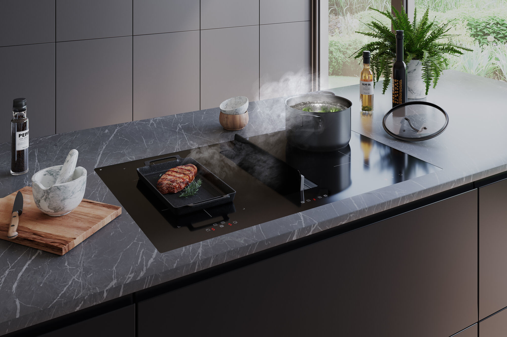 De kookplaat heeft een randloos design en is gemakkelijk te bedienen met de gepatenteerde tiptoetsbediening. Daarnaast beschikt het over een timerfunctie en kookduurbegrenzing. Veiligheid staat voorop, daarom is de kookplaat tevens voorzien van een kinderslot en restwarmte indicatie. Dankzij de geïntegreerde afzuiging heb je geen aparte afzuigkap meer nodig. De afzuigunit heeft 1 motor met een capaciteit van 609 m³/h, met een maximale luchtstroom van 684 m³/h op de intensiefstand. De motor is op verschillende manieren te plaatsen voor een optimale indeling en voldoende ruimte voor je lades. De afzuigingunit in de kookplaat is gemakkelijk schoon te maken en is geschikt voor afvoer naar buiten en recirculatie met een koolstoffilter of plasmafilter. Je huis blijft tijdens en na het koken heerlijk fris ruiken.