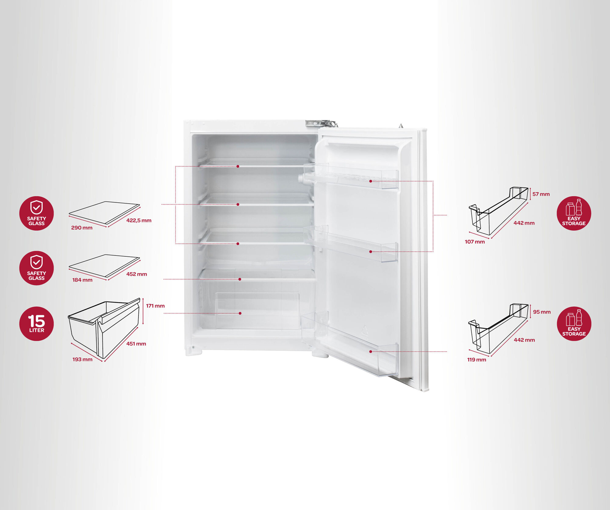 De Inventum inbouw koeler IKK0881D is geschikt voor een standaard nismaat van 88 cm en heeft een netto inhoud van 134 liter. Het is een zuinige koeler met energieklasse E. De koeler heeft vier draagplateaus en onderin een transparante groentelade. Met twee deurvakken, een flesvak en twee eierrekjes berg je al je etenswaren netjes op. Deze onderdelen zijn eenvoudig te verwijderen, zodat je deze goed kunt schoonmaken.