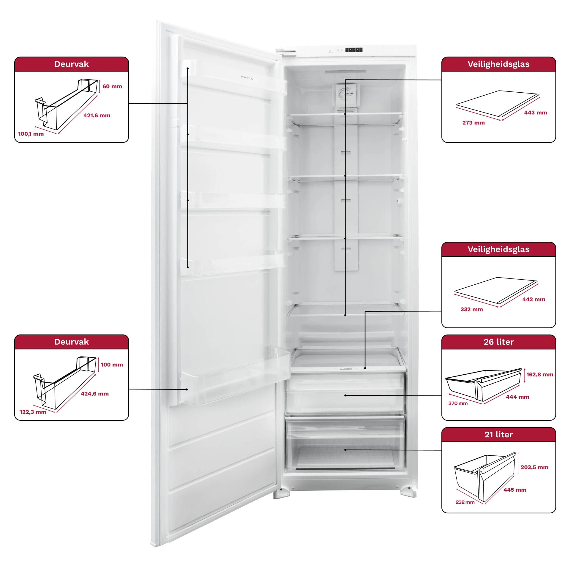 De Inventum inbouw koeler IKK1785S is geschikt voor een standaard nismaat van 178 cm en heeft een netto inhoud van 294 liter. Het is een koeler met energieklasse F. Door het Fresh Cooling System is de temperatuur in de koeler overal gelijk. Met de superkoelenstand kun je voedsel snel koelen. Door de ideale temperatuur en de aangepaste luchtvochtigheid in de verslade worden groente en fruit perfect bewaard. De koeler heeft 5 draagplateaus en onderin 2 transparante lades. Met 4 deurvakken, 1 flessenvak en 1 eierrekje berg je al je etenswaren netjes op. Deze onderdelen zijn eenvoudig te verwijderen, zodat je ze goed kunt schoonmaken.