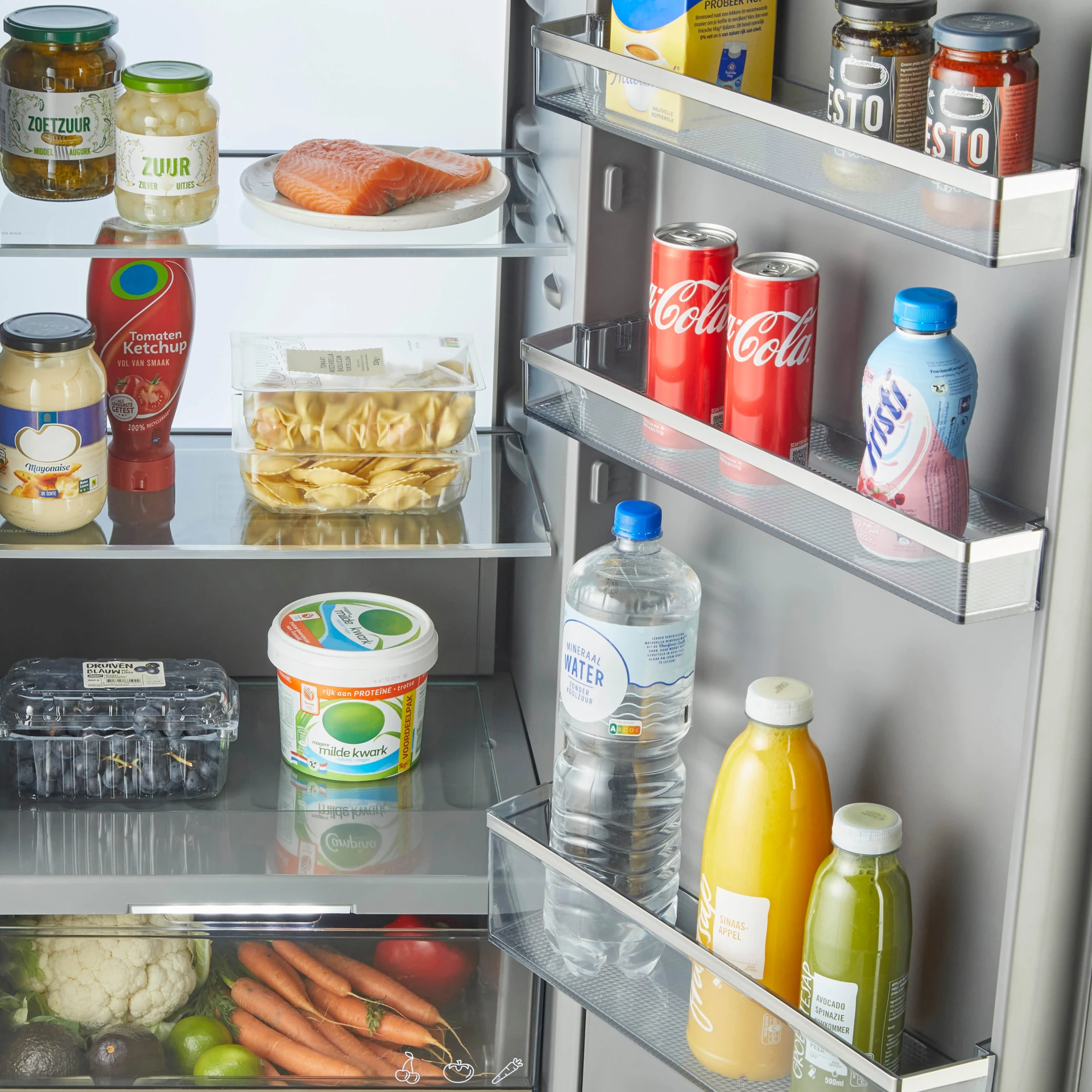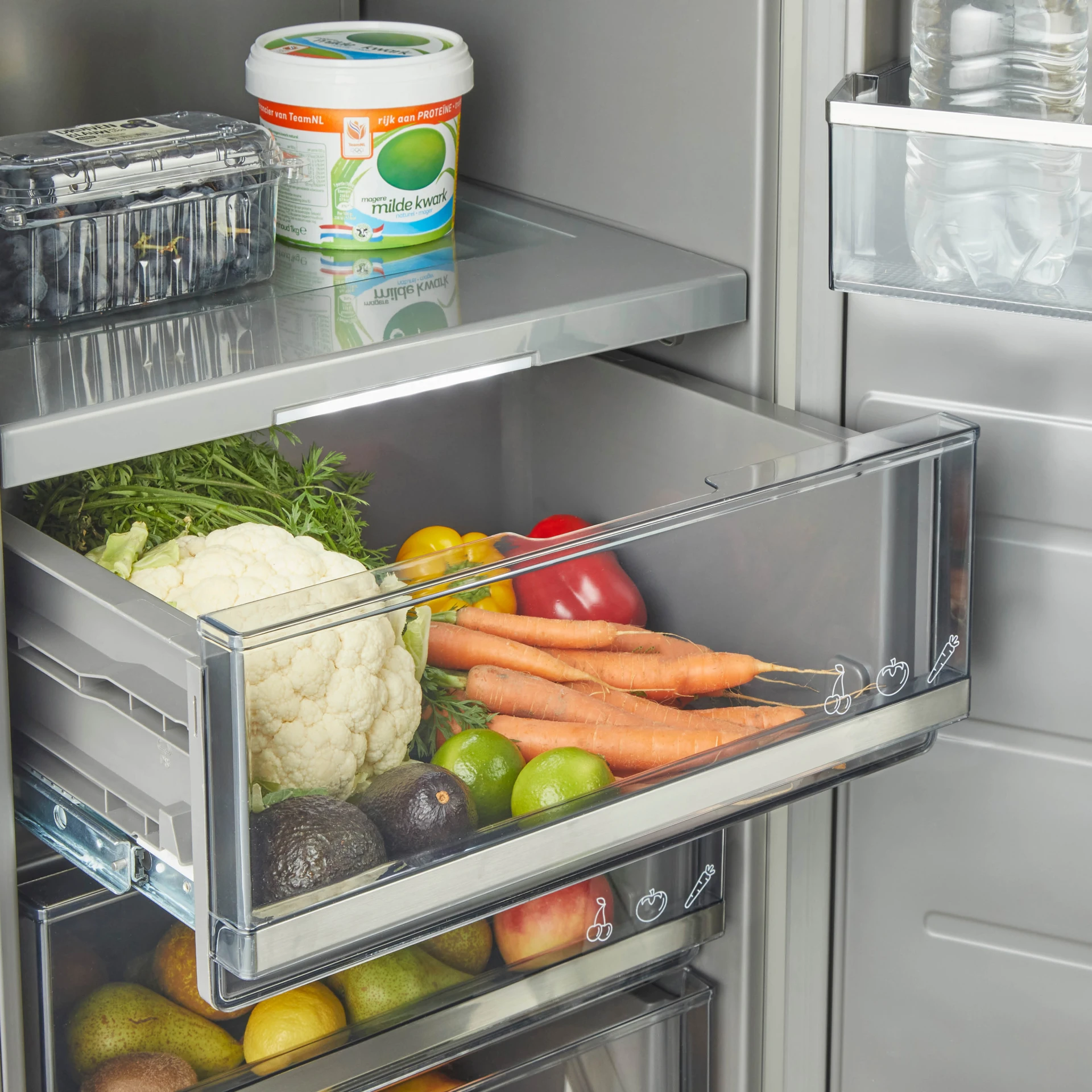 De 3 koelkastlades in de Veggie zone kun je instellen op een temperatuur tussen 0 en +5 °C. Je etenswaren blijven langer vers en vitamines en mineralen gaan niet verloren. Ideaal voor het bewaren van groente en fruit.