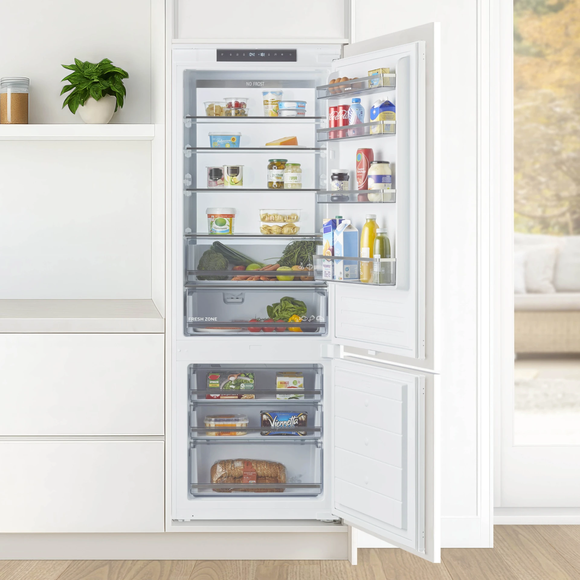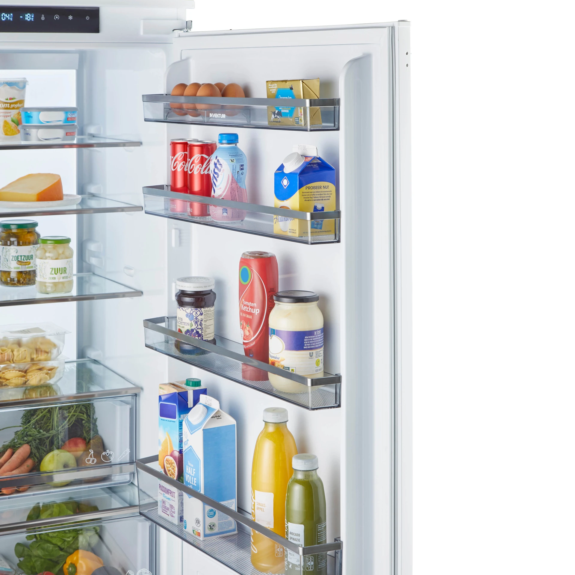 De Inventum inbouw koel-vriescombinatie IKV1947S met een inhoud van 341 liter en energieklasse D, is 69 cm breed en geschikt voor een nis van 194 cm. Het ruime koelgedeelte van 257 liter heeft een luxe ambient light achterwand. In de handige Fresh zone groentelade en door superkoelen kun je al je etenswaren extra lang bewaren. Het vriesgedeelte met supervriezen heeft 3 transparante lades en een inhoud van 84 liter. In deze No Frost koelkast is genoeg ruimte om al je etenswaren netjes op te bergen. De 4 draagplateaus, 4 deurvakken en 5 lades zijn eenvoudig te verwijderen, zodat je ze gemakkelijk kunt schoonmaken.