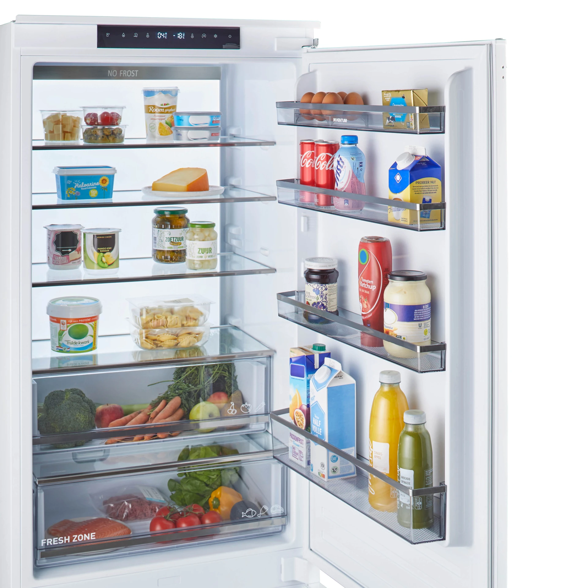 De Inventum inbouw koel-vriescombinatie IKV1947S met een inhoud van 341 liter en energieklasse D, is 69 cm breed en geschikt voor een nis van 194 cm. Het ruime koelgedeelte van 257 liter heeft een luxe ambient light achterwand. In de handige Fresh zone groentelade en door superkoelen kun je al je etenswaren extra lang bewaren. Het vriesgedeelte met supervriezen heeft 3 transparante lades en een inhoud van 84 liter. In deze No Frost koelkast is genoeg ruimte om al je etenswaren netjes op te bergen. De 4 draagplateaus, 4 deurvakken en 5 lades zijn eenvoudig te verwijderen, zodat je ze gemakkelijk kunt schoonmaken.