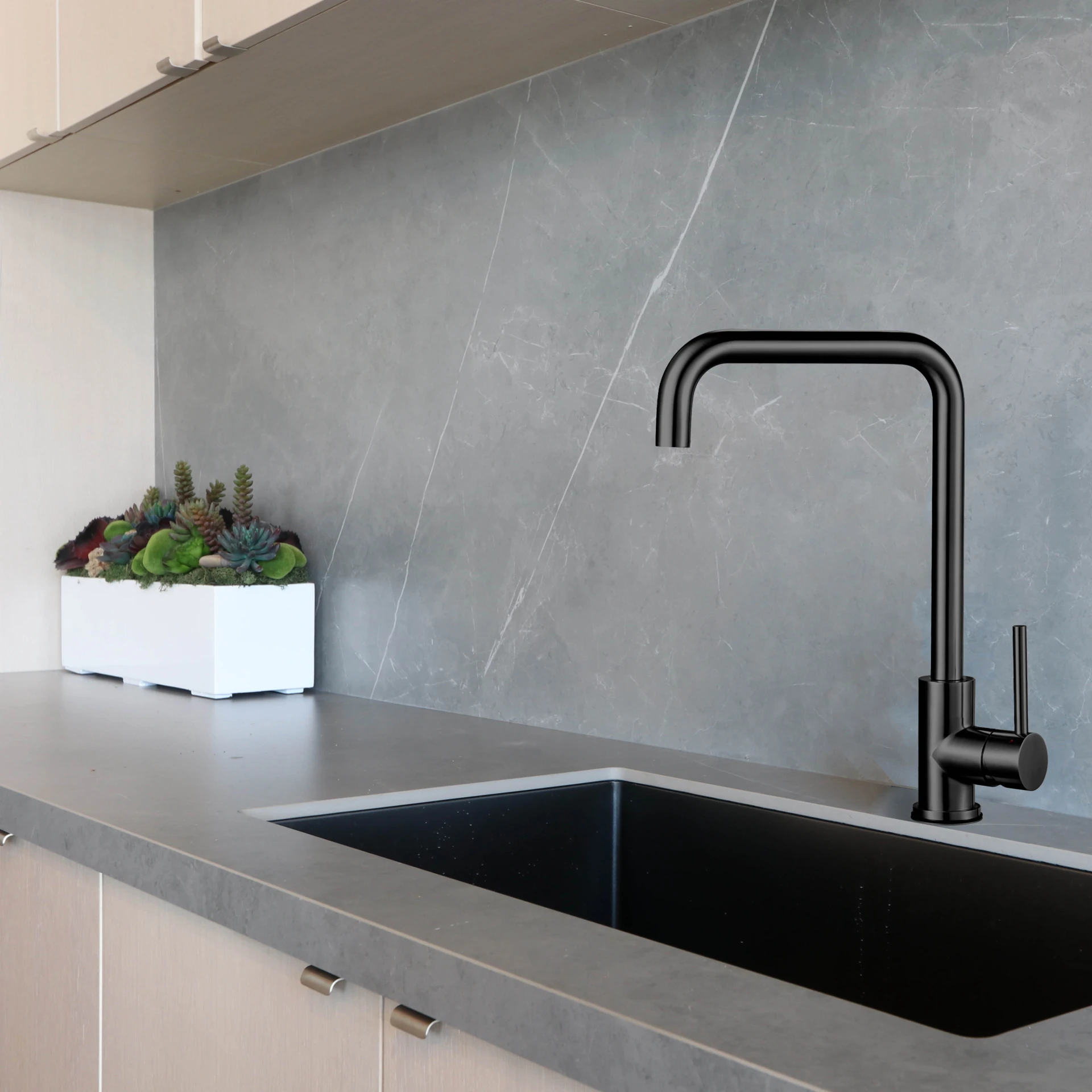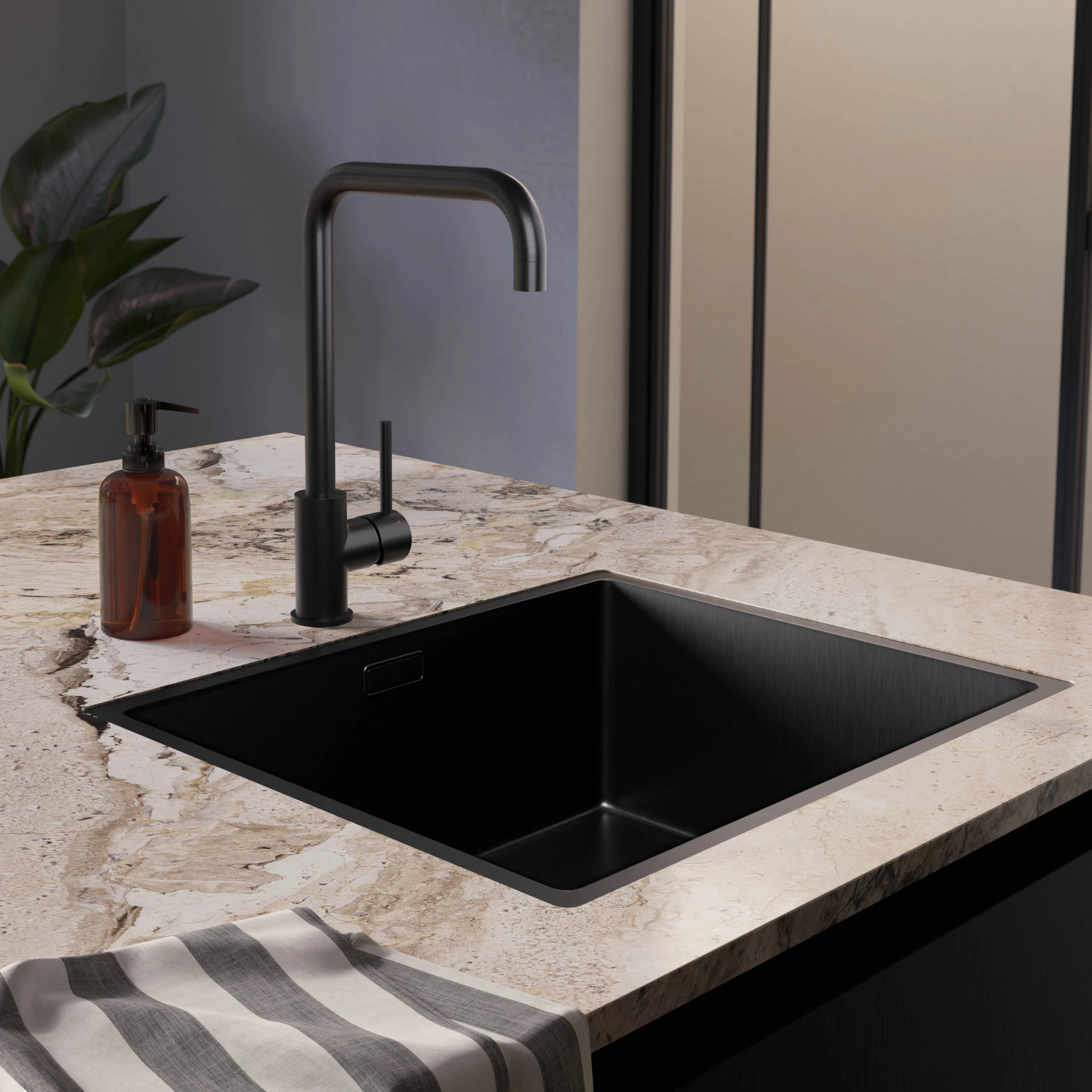 De modern vormgegeven zwarte mengkraan IMK501ZWA heeft een U-uitloop en is helemaal van roestvrijstaal (rvs). Met 1 hendel zet je de kraan aan en stel je de temperatuur van het water in. Je kunt de uitloop alle kanten op draaien en zelfs helemaal rond, want het bereik is 360°. De kraan heeft een keramisch binnenwerk en een waterbesparende perlator. Je ontvangt er 2 flexibele aansluitslangen bij van 60 cm lang. Montage kan tot op een maximaal 8 cm dik werkblad. De kraan is alleen geschikt voor gebruik in huis.