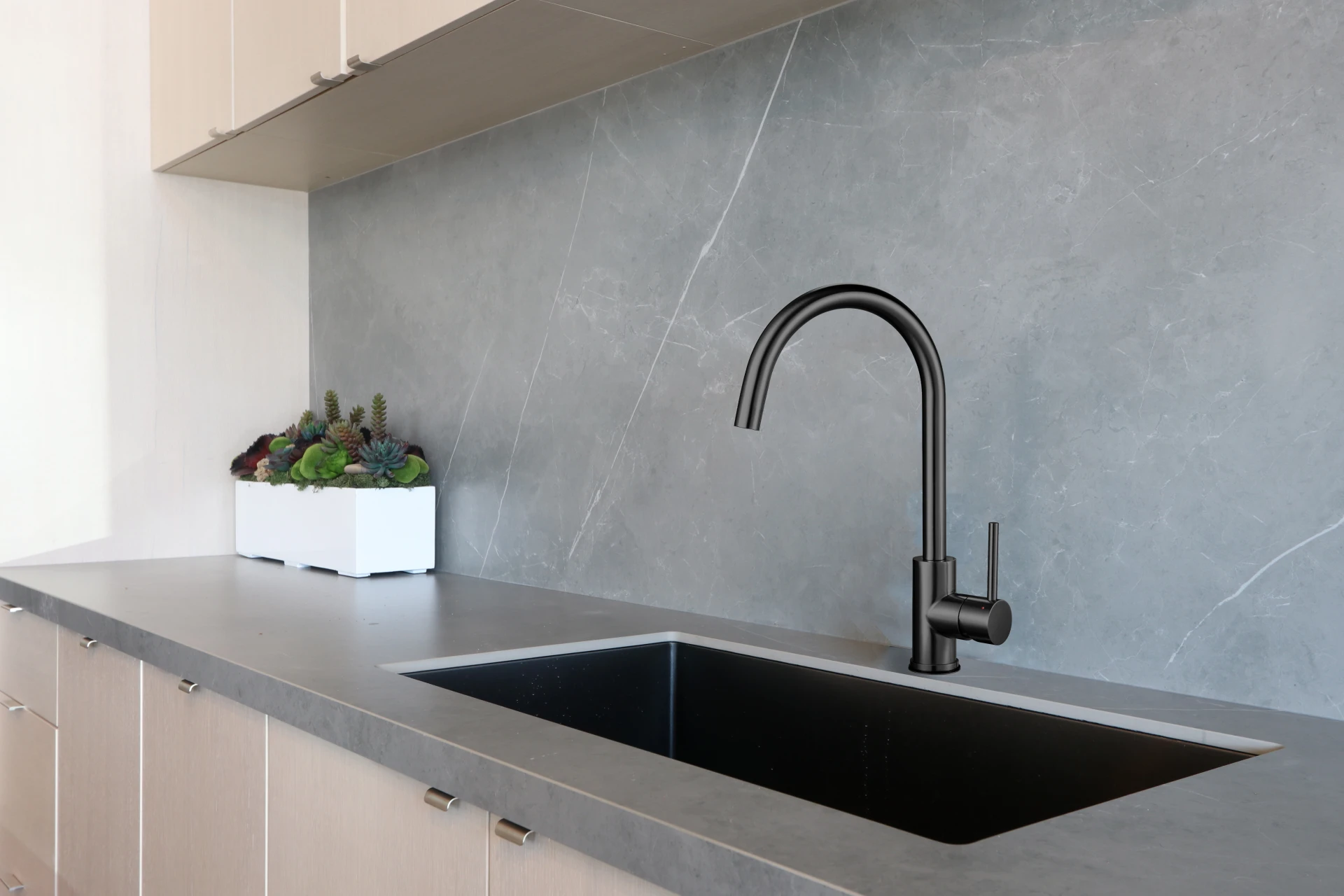 De tijdloos vormgegeven zwarte mengkraan IMK601ZWA heeft een C-uitloop en is helemaal van roestvrijstaal (rvs). Met 1 hendel zet je de kraan aan en stel je de temperatuur van het water in. Je kunt de uitloop alle kanten op draaien en zelfs helemaal rond, want het bereik is 360°. De kraan heeft een keramisch binnenwerk en een waterbesparende perlator. Je ontvangt er 2 flexibele aansluitslangen bij van 60 cm lang. Montage kan tot op een maximaal 8 cm dik werkblad. De kraan is alleen geschikt voor gebruik in huis.