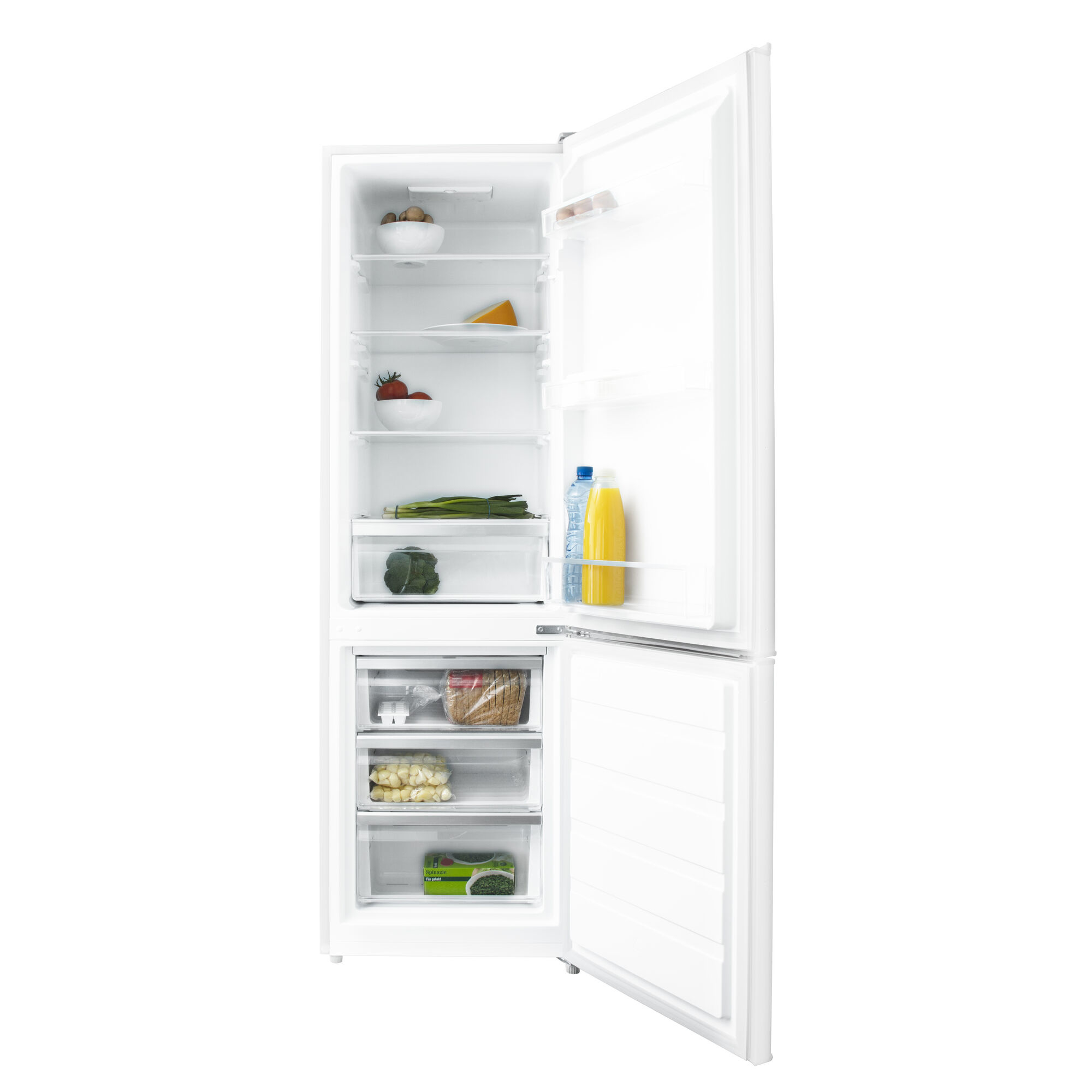 Het geluidsniveau van de Inventum koelvriescombinatie KV1800W is maximaal 39 decibel, en daar kun je nog rustig een gesprek bij voeren. Je merkt dus niet dat deze koelkast er is. De vriezer kan een temperatuur van -24 °C bereiken en heeft een invriescapaciteit van 3,5 kilo per 24 uur. De vrieslades zijn transparant zodat je de gewenste producten snel ziet liggen. Het koelgedeelte heeft vier glazen plateaus, een groentelade, een flessenvak en twee deurvakken. Je kunt je levensmiddelen dus allemaal een eigen plaatsje geven en moeiteloos orde houden in je voorraden. Als je wilt schoonmaken, kun je alle onderdelen gemakkelijk verwijderen. Het is ook fijn dat je de legplateaus in hoogte kunt verstellen om de koelruimte optimaal te benuttten en ook ruimte te maken voor een grote meloen of een kerstkalkoen. Met de Inventum koelvriescombinatie KV1800W haal je een veelzijdige en betrouwbare koelkast in huis.