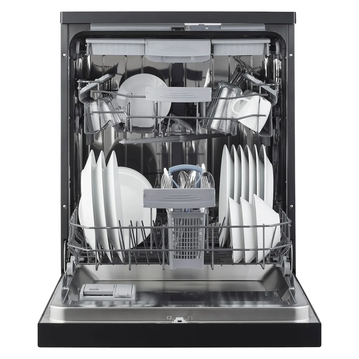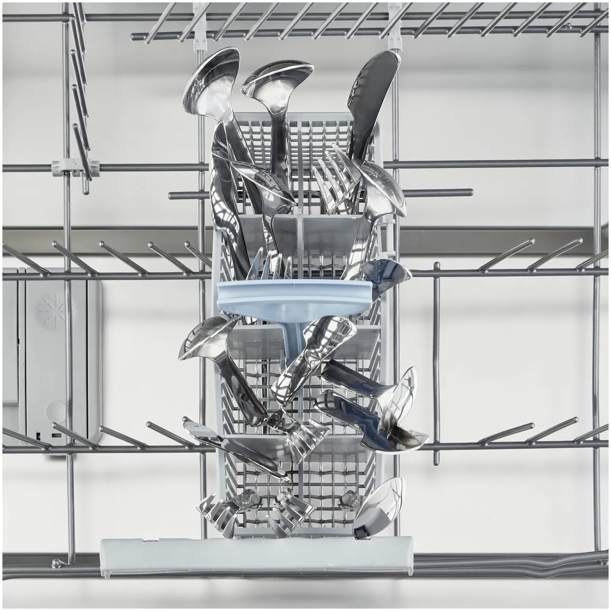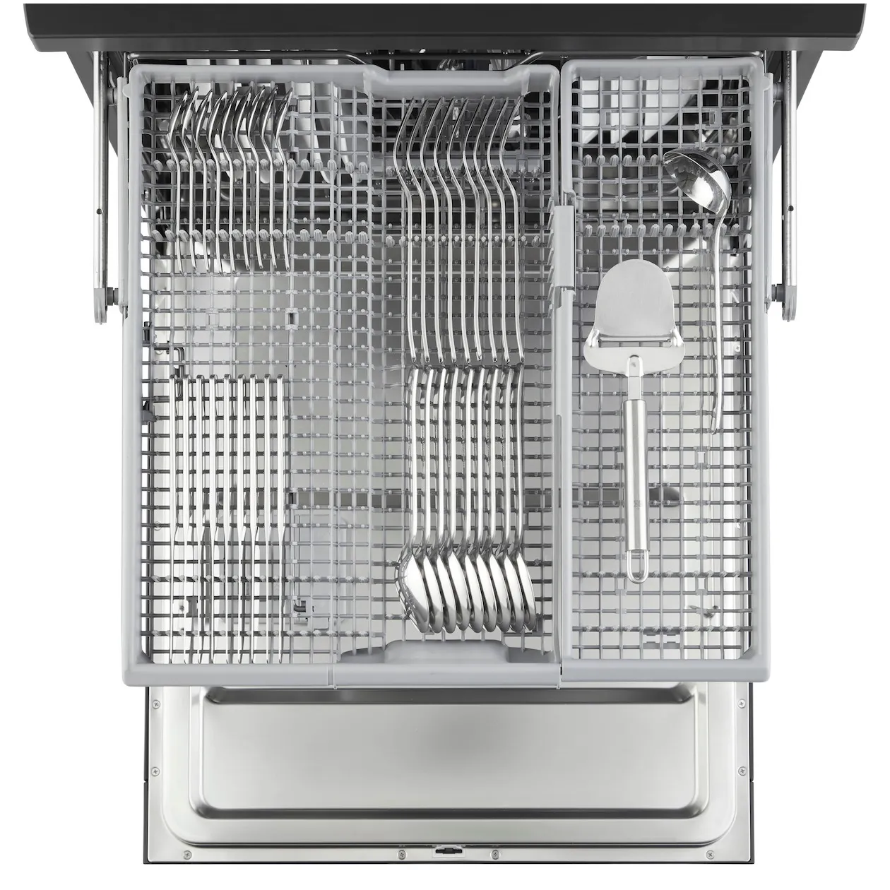 Besteklade bovenin en bestekmandje onderin de vaatwasser