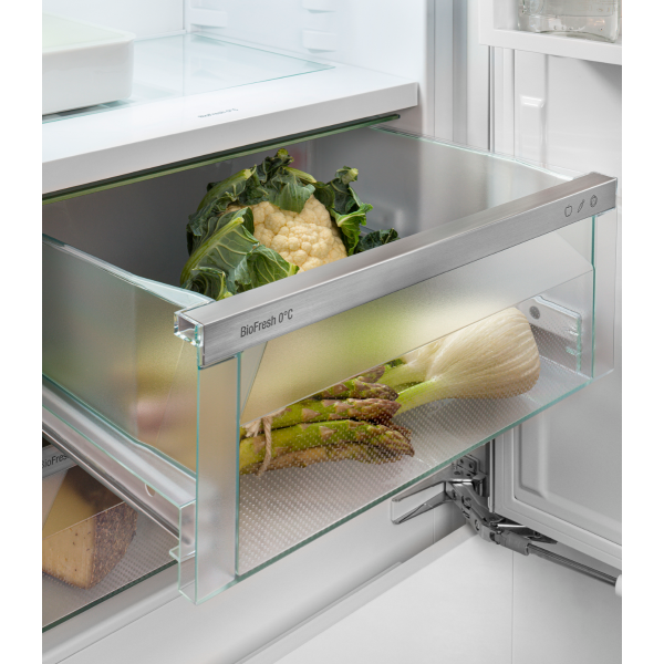 Deze inbouwkoelkast biedt net dat beetje extra. De deur met SoftSystem sluit altijd zacht en volledig. Het deelbare draagplateau en het geïntegreerde flessenplateau bieden extra flexibiliteit. In de 2 BioFresh laden op telescooprails bewaart u groenten en fruit tot 3x langer dan in een normale groentelade. De temperatuur is via het Monochroom display met Touch-bediening instelbaar en toont naast de actuele temperatuur ook alarmmeldingen bij bijv. een stroomstoring. Voorbereid voor smarthome toepassingen.