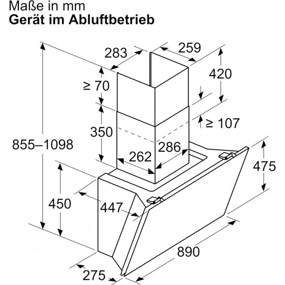 Hoogte apparaat luchtafvoer min. 855 mm