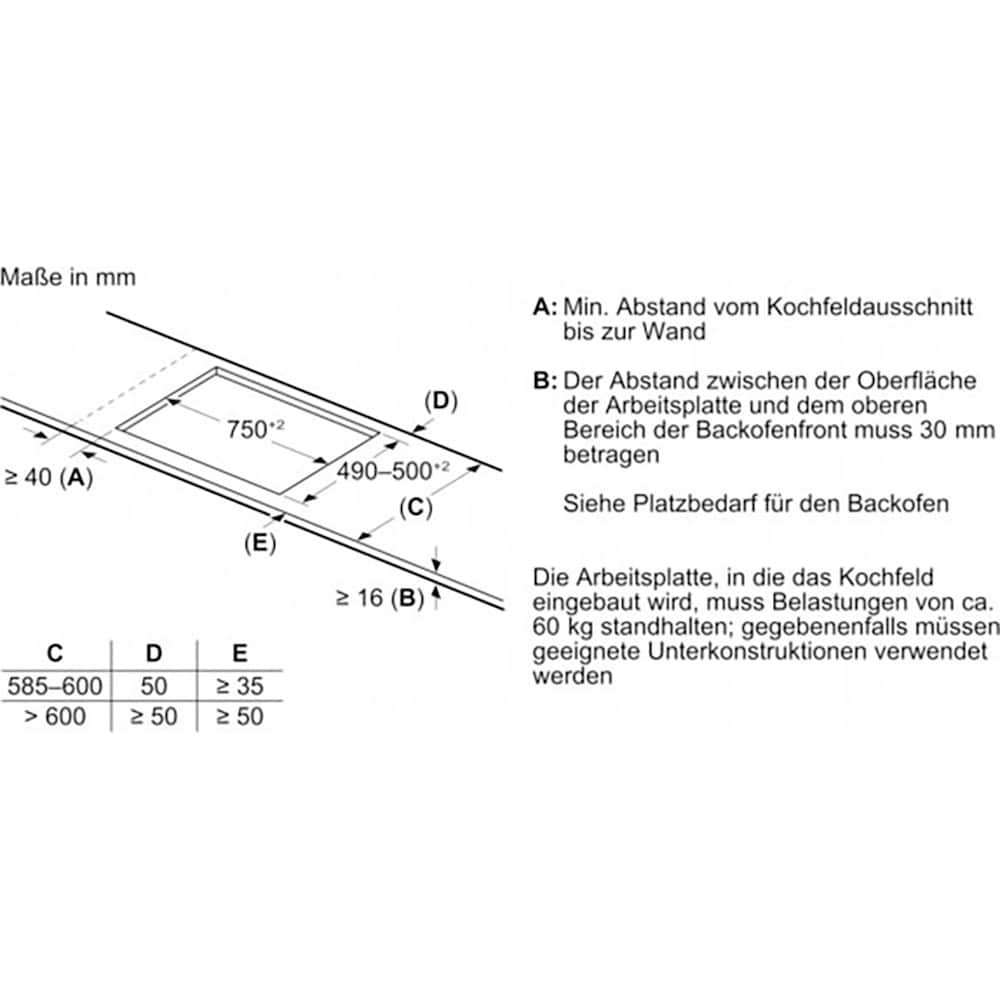 Min. nisafmetingen voor inbouw (H x B x D) 51 x 750-750 x 490-500 mm