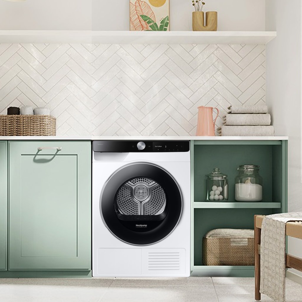 De Samsung-warmtepompdroger DV90DG6845LKU3, uit de AI Dry 6000-serie, combineert slimme technologie met een strak, eigentijds design in helder wit, met een transparante deur met zwarte rand. Dankzij de standaardafmetingen van 85 cm hoog, 60 cm breed en 60 cm diep past dit toestel moeiteloos in elke wasruimte. Met zijn royale capaciteit van 9 kilo biedt deze droogkast voldoende ruimte voor grotere ladingen, zoals beddengoed, handdoeken of een complete gezinswas. Tot slot verhoogt de omkeerbare deur het gebruiksgemak: je kiest zelf de openingsrichting die het beste past bij je wasruimte.