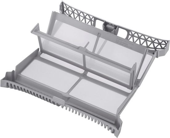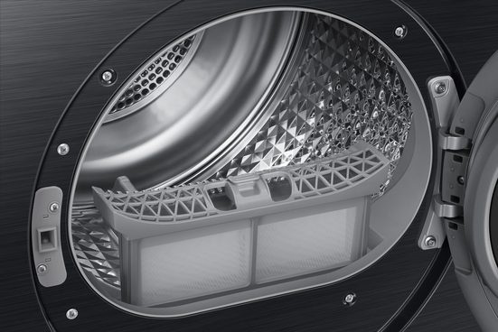 Het 2-laagse stoffilter bevindt zich onder de deur en is eenvoudig te verwijderen en schoon te maken. Extra filters voor de warmtepomp zijn overbodig. Samsung warmtepompdrogers hebben een filterreinigingsalarm dat je eraan herinnert het filter schoon te maken, en een extra alarm dat je na elke 25 droogbeurten herinnert de condensor te reinigen.