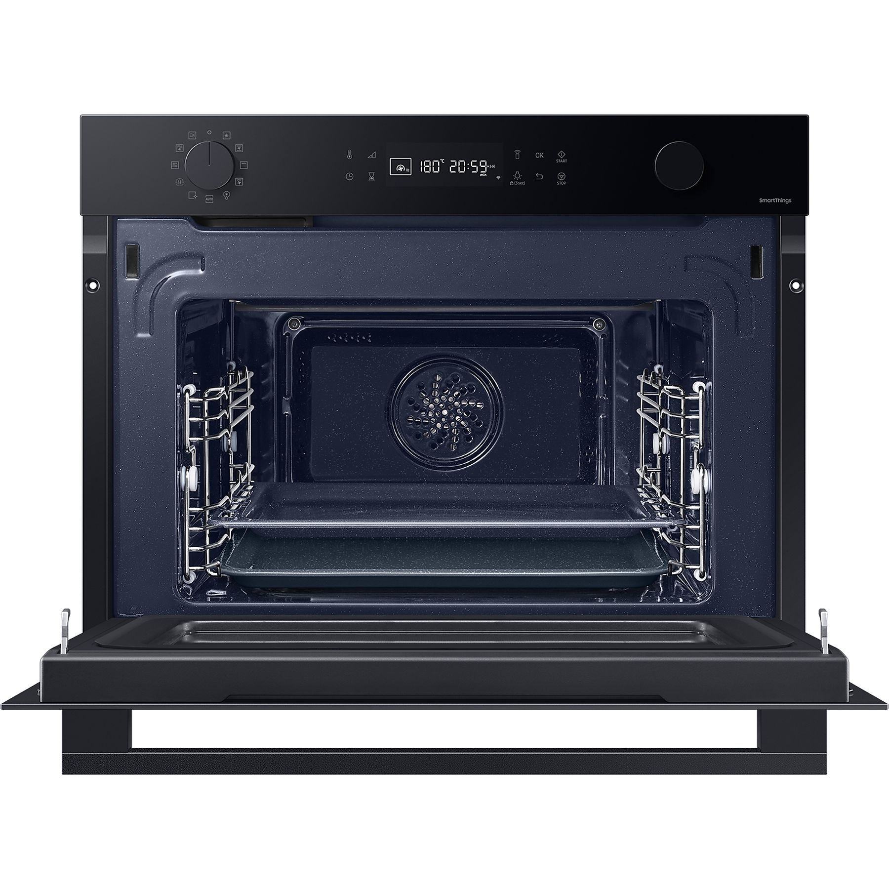 Zet elke dag een nieuwe kookcreatie op tafel met de 20 programma’s van deze veelzijdige combimagnetron. Naast typische magnetronfuncties, zoals opwarmen en ontdooien, zitten er ook diverse ovenprogramma’s in het arsenaal. Van bakken tot grillen, het kan allemaal. Het apparaat is eenvoudig in te stellen via de gebruiksvriendelijke bediening met draaiknoppen en tiptoetsen. Wie het zichzelf graag wat gemakkelijker maakt, koppelt het apparaat echter ook met de SmartThings Cooking-app. Hiermee bedien jij de oven gewoon vanuit je luie stoel. En met Auto Cook kies je snel een voorgeprogrammeerde stand, zodat je zelfs daar niet over na hoeft te denken.