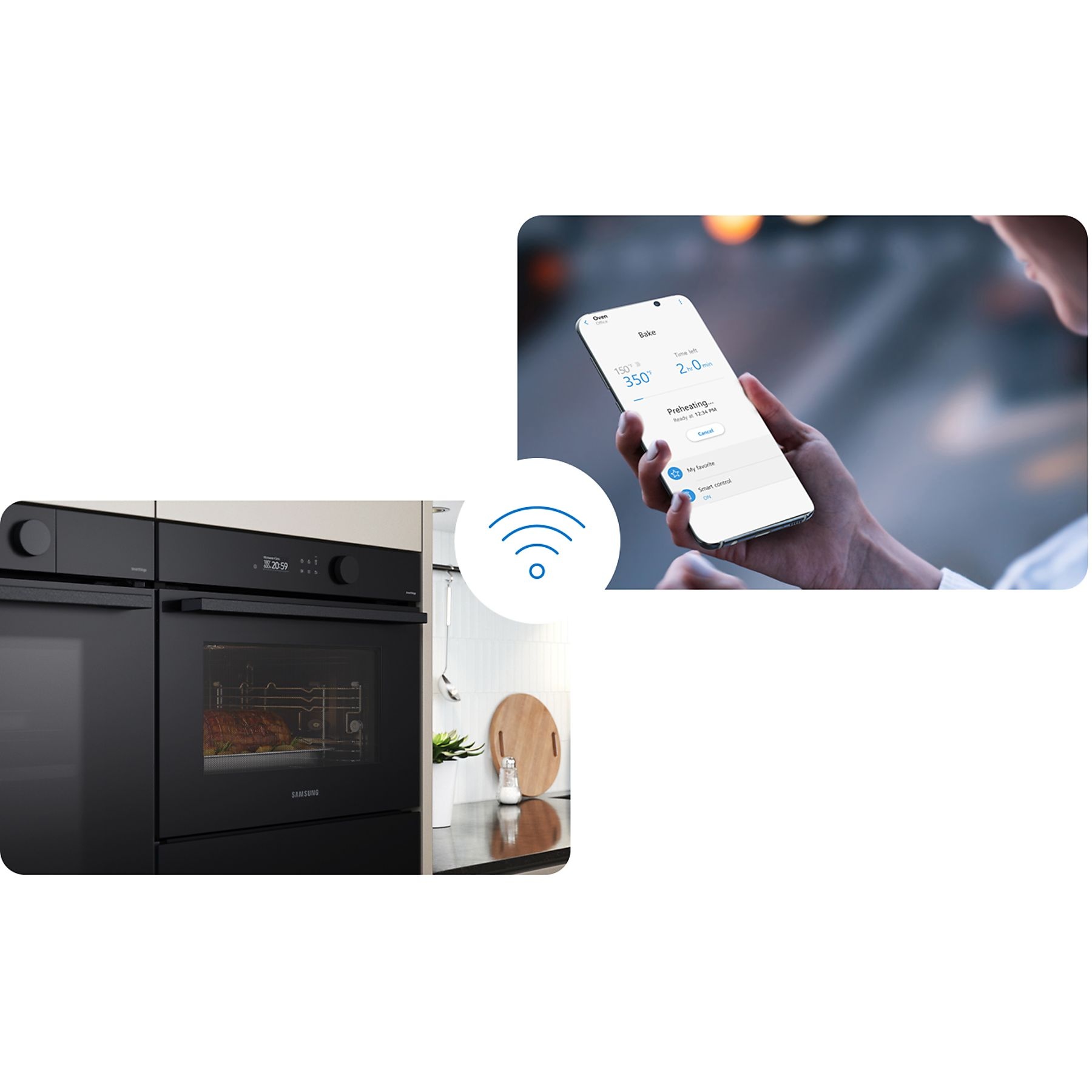 Zwarte oven naast aanrecht met houten snijplank, wifi-symbool en een hand met een telefoon die de oven-app toont.