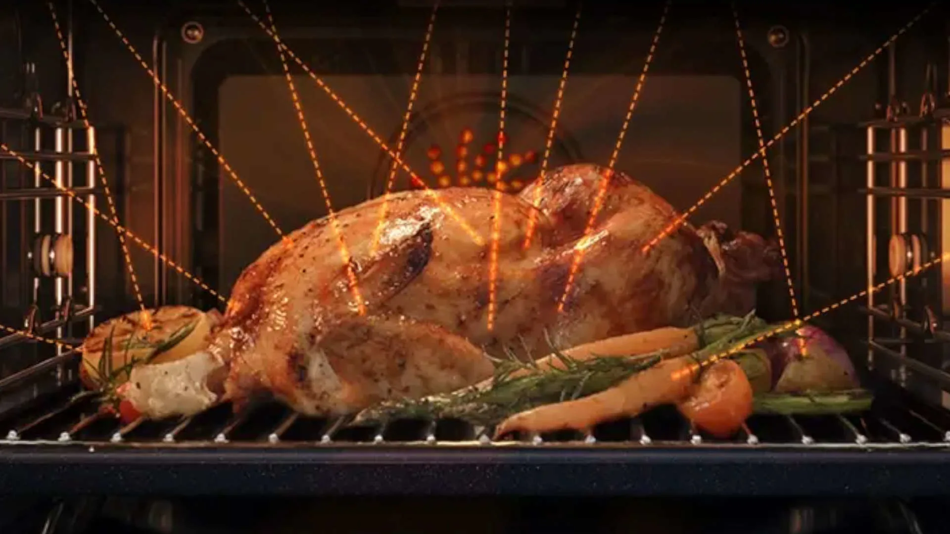 Een gebraden kip op een grill in een oven, met groenten eromheen. Oranje lijnen suggereren warmte.