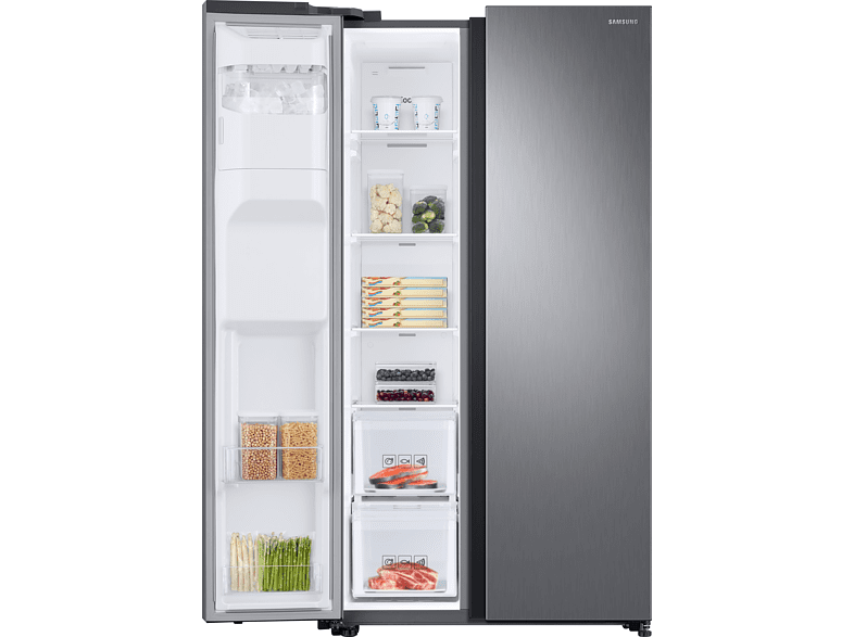 De RS8000-koelkast van Samsung heeft een grotere inhoud dankzij de SpaceMax Technology™ die van binnen meer volume creëert zonder dat daarbij de buitenste afmetingen van de koelkast toenemen. Met 617 liter passen er wel 3 boodschappen wagentjes in!