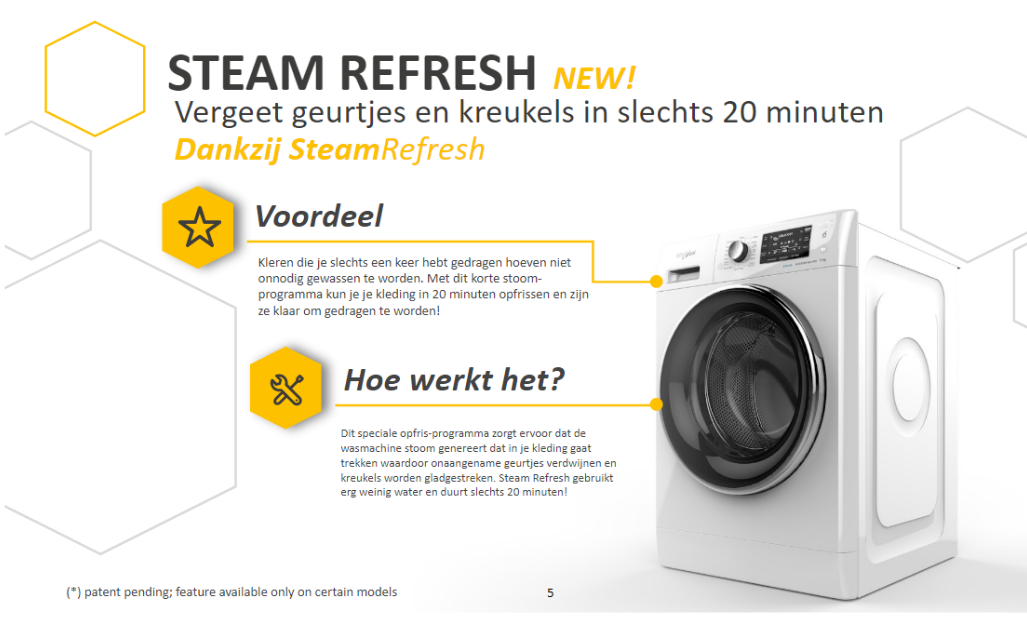 Dankzij SteamRefresh. Kleding die slechts een keer is gedragen hoeft niet onnodig gewassen te worden. Met dit korte stoom programma kun je je kleding in 20 minuten opfrissen en zijn ze klaar om gedragen te worden.